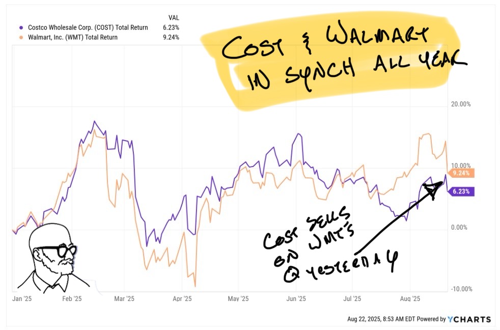 Walmart had a great quarter and is growing into the expanded multiples being paid for the shares over the last few years. That said, inflation is the more frightening headwinds for all retailers and those two aren't an exception. In uncertain times the big players trade in synch, which is why COST and WMT have been pretty much in lockstep all year: