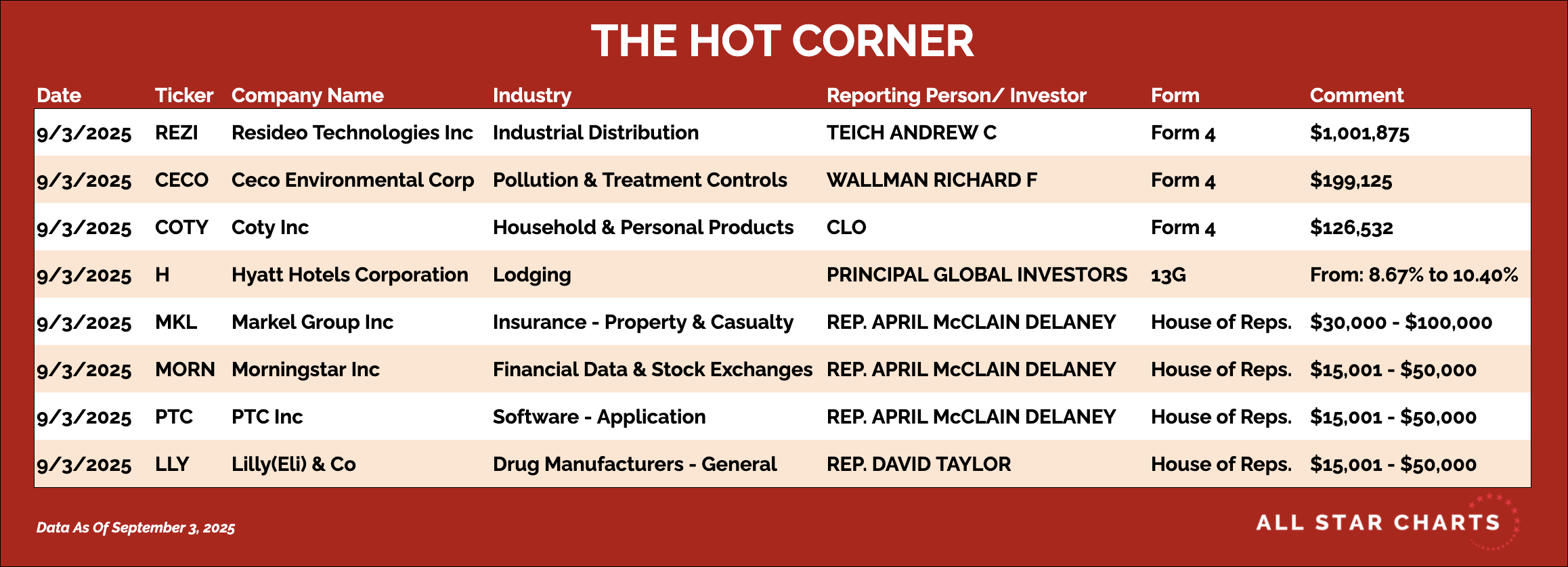 πŸ“Œ Rep. April McClain Delaney – Disclosed buys in Markel $MKL ($30,000 to $100,000), Morningstar $MORN ($15,000 to $50,000), and PTC $PTC ($15,000 to $50,000).