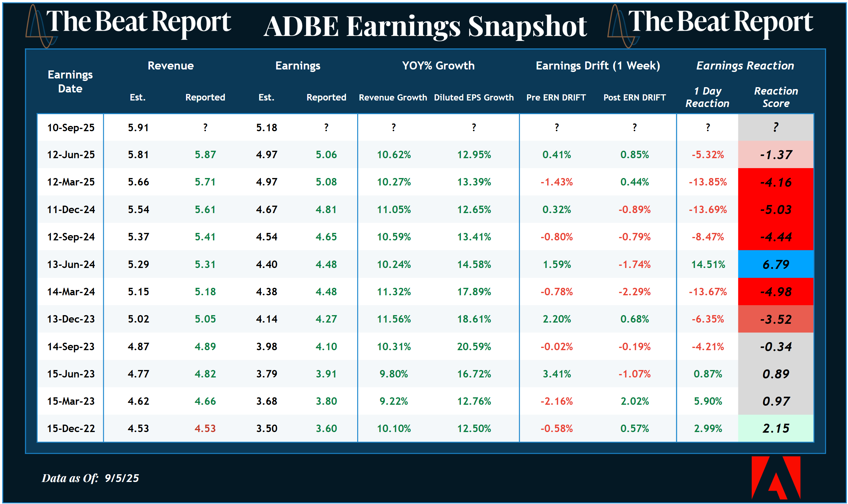 As you can see, seven of Adobe's last eight earnings events have been beat/beat/drops. This negative fundamental backdrop supports the negative technicals.