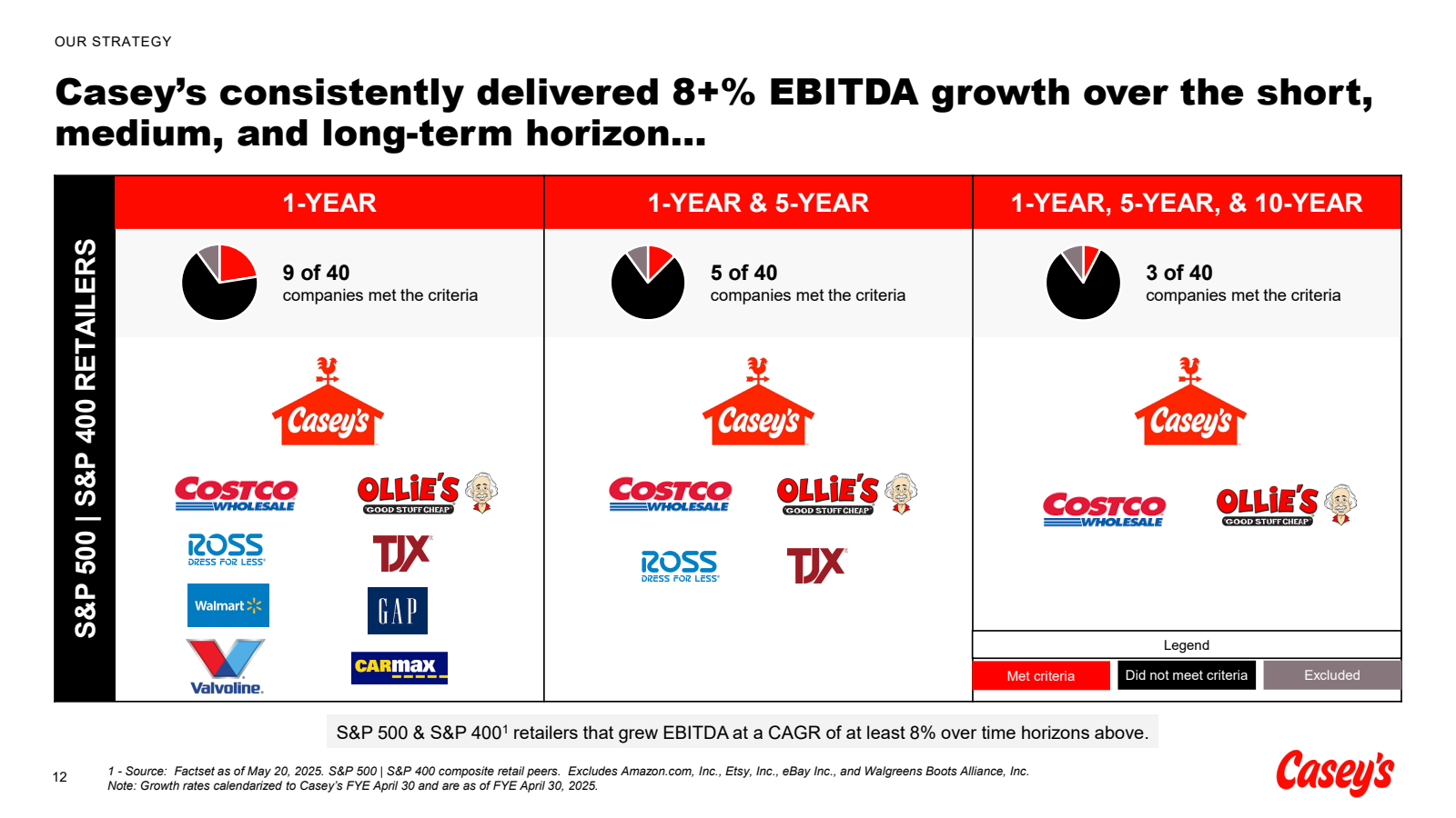 Casey’s is 1 of only 3 retailers in the S&P 500 and S&P 400 that have managed to deliver more than 8% EBITDA growth across 1-, 5-, and 10-year periods. The other names are Costco $COST and Ollie’s Bargain Outlet $OLLI.