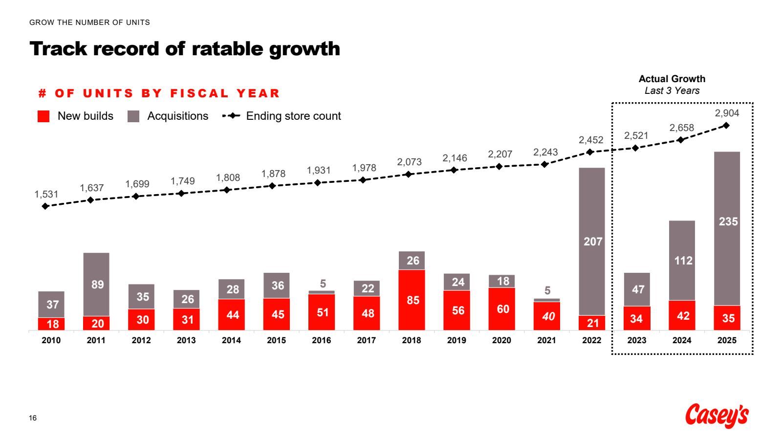 From 2010 to 2021, Casey’s expanded steadily year after year. Then in 2022, acquisitions accelerated at a record pace. In 2025, the company broke that record again, adding 235 stores and pushing its footprint just shy of 2,900 locations.