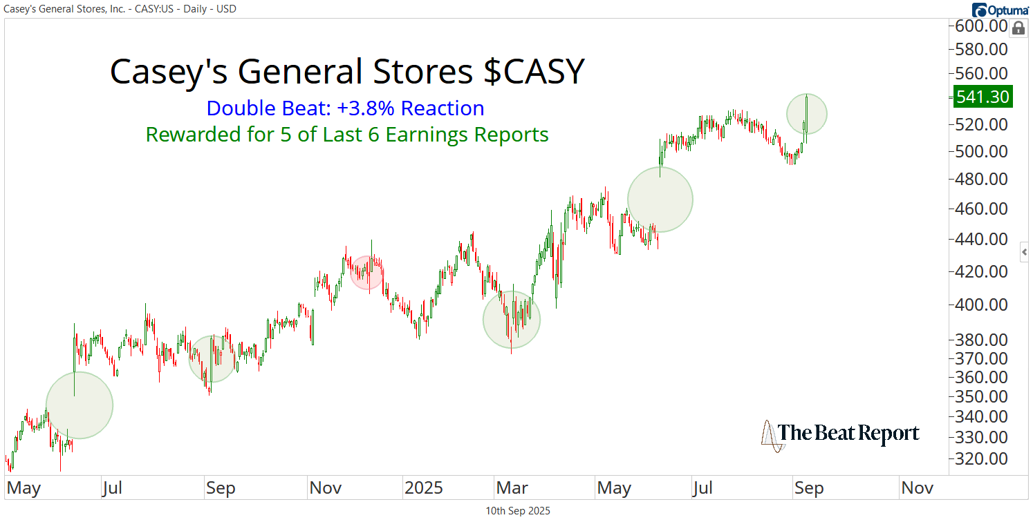 The market rewarded that consistency with a 3.8% rally on Tuesday, marking the 5th positive earnings reaction out of the last 6 quarters. For a company that sells pizza, gas, and groceries, Casey’s has been one of the best compounders in the entire market.