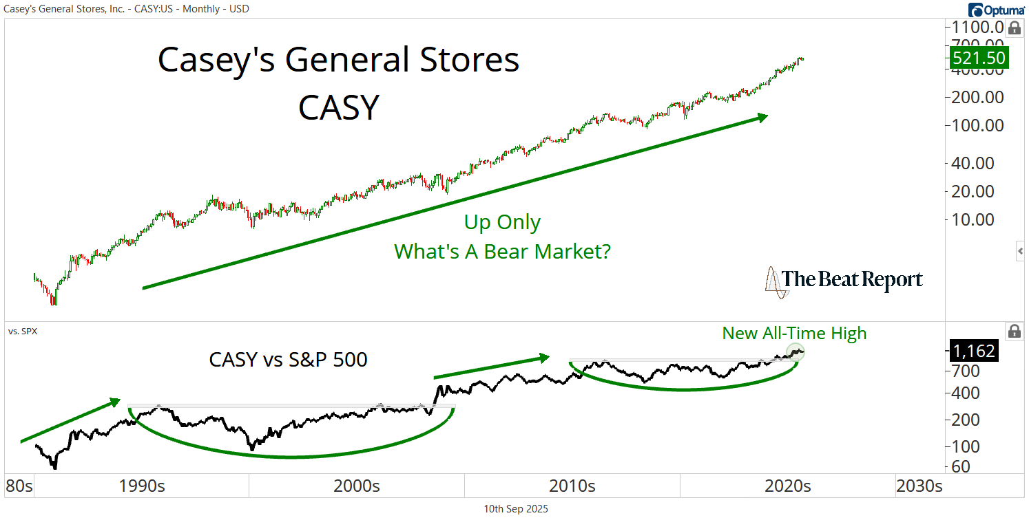 Casey’s doesn’t really have bear markets. It has compounded higher for decades, largely immune to the drawdowns that hit most of retail.
