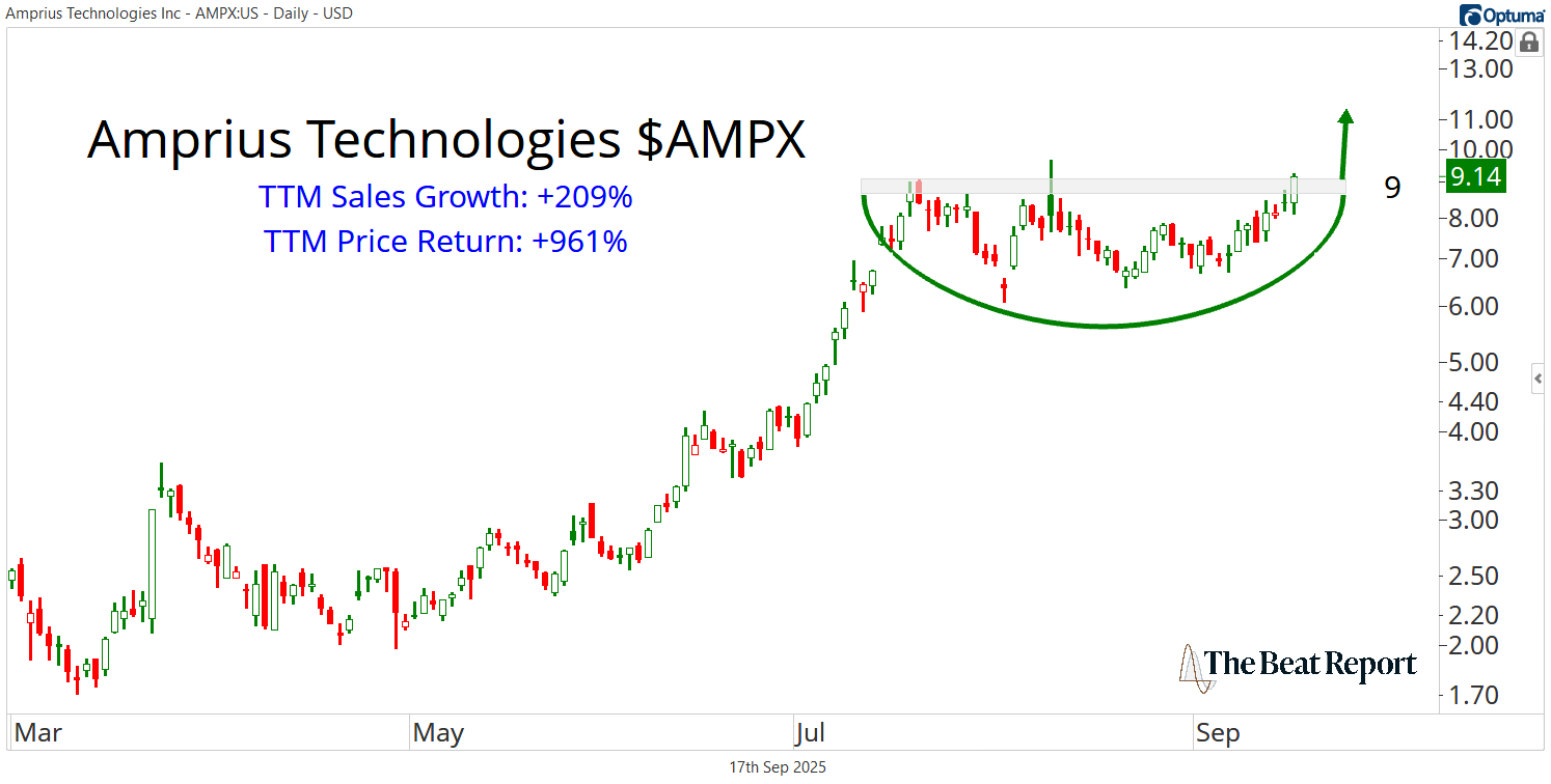 Amprius Technologies has grown sales by over 200% year-over-year while the stock has returned nearly +1,000%. Technically, the stock appears to be poised for further gains.