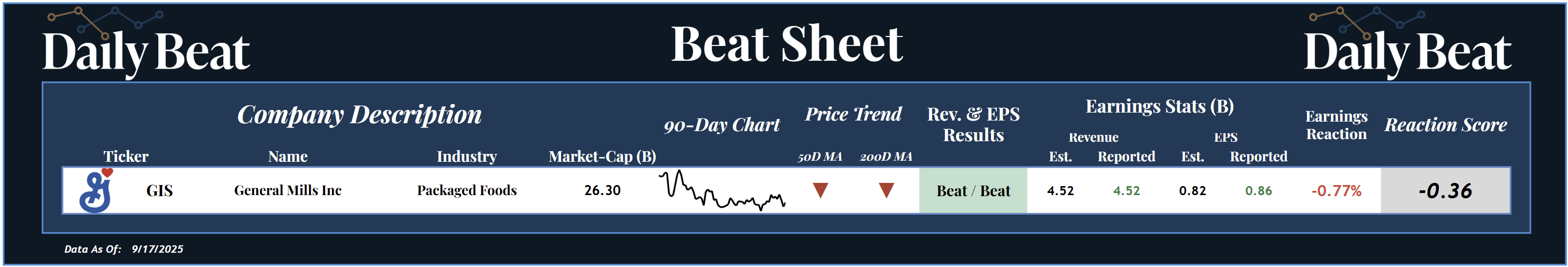 The only S&P 500 earnings reaction on Wednesday came from the $26B packaged foods giant, General Mills $GIS, which had a -0.36 reaction score after posting better-than-expected headline results.