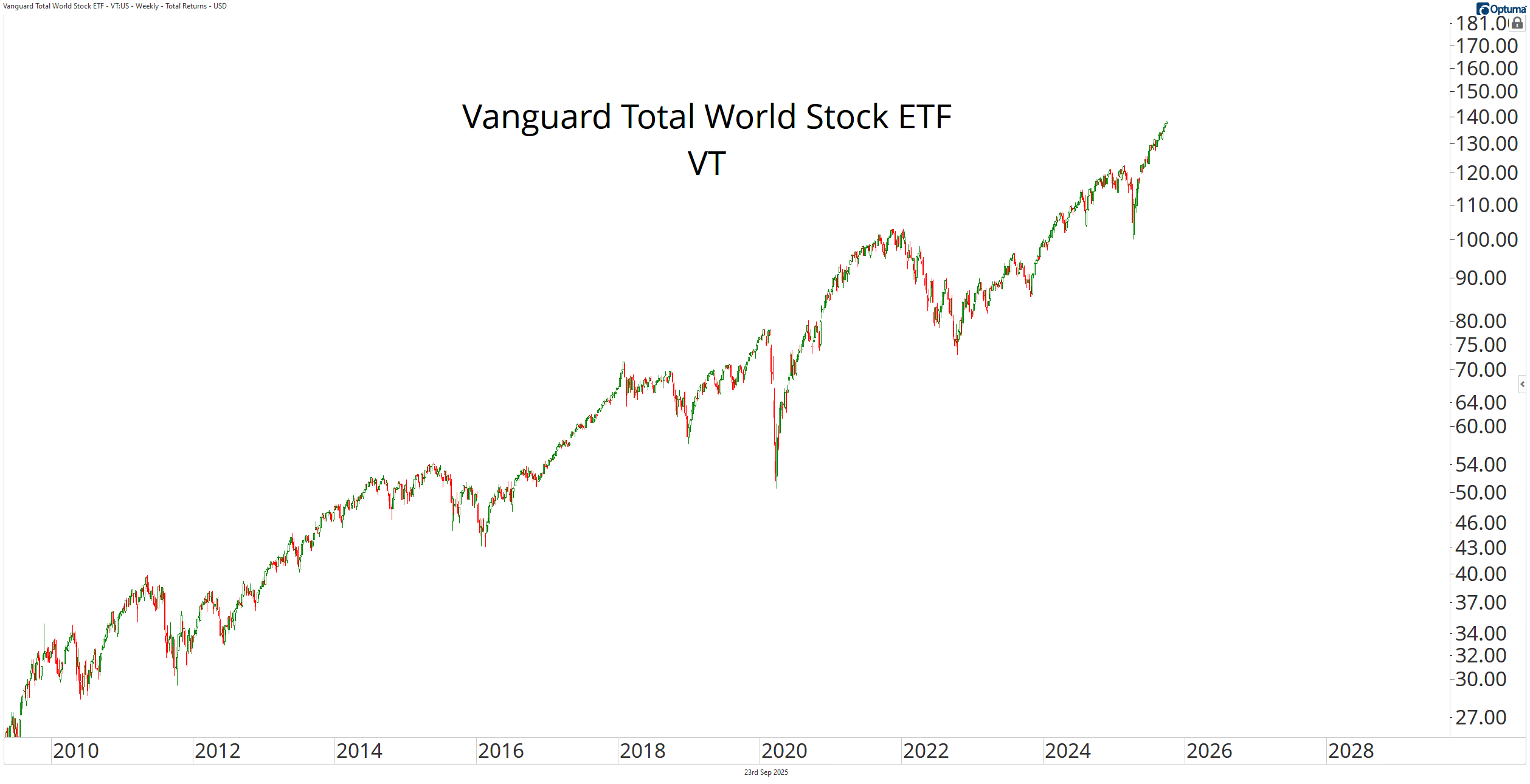 A great example is what I consider the single-best ETF mankind has ever created: the Vanguard Total World Stock ETF $VT. With over 9,000 holdings, it provides exposure to the entire investable global stock market.