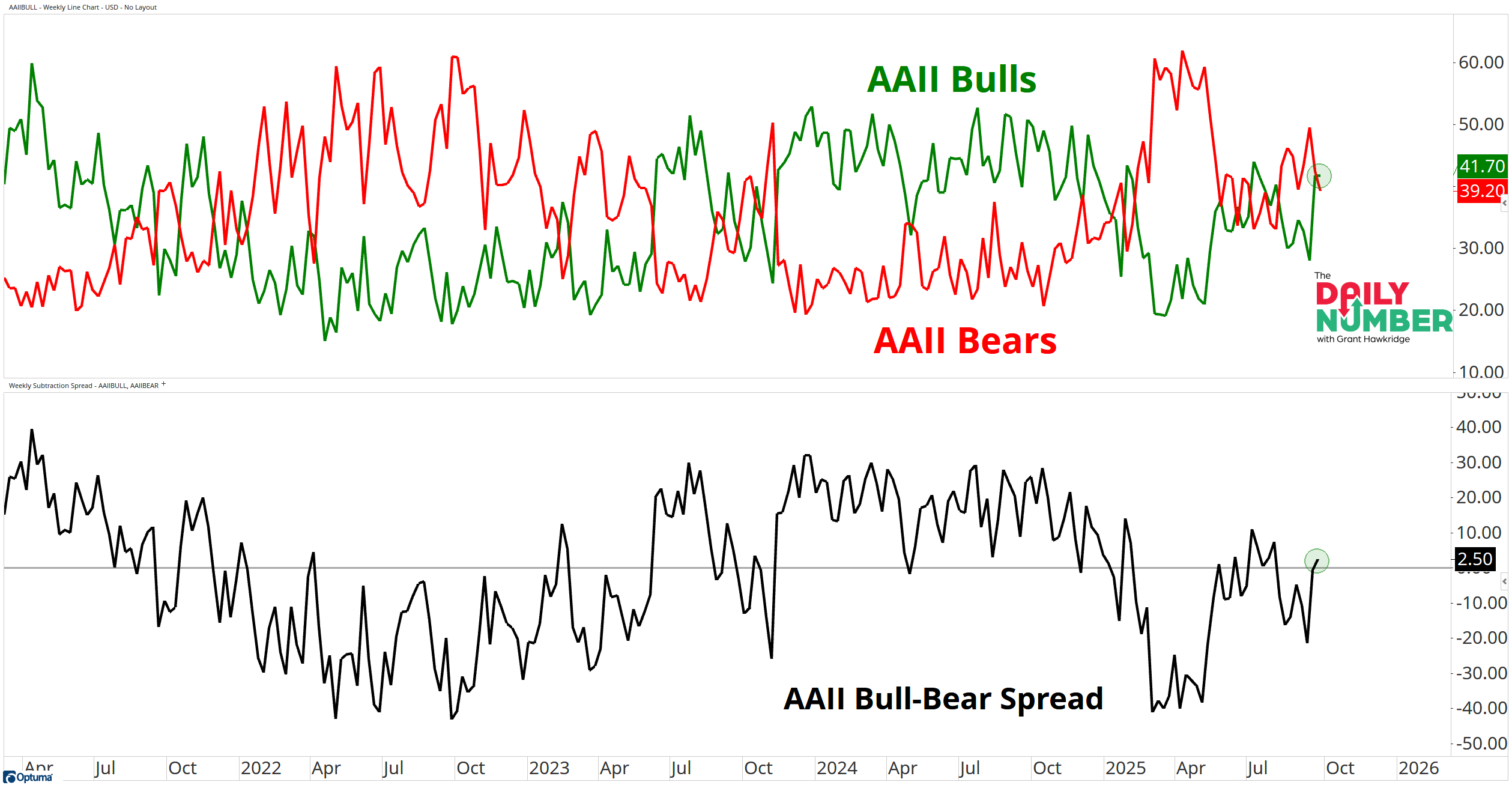 After seven straight weeks of negative readings, the AAII spread has flipped back to positive.