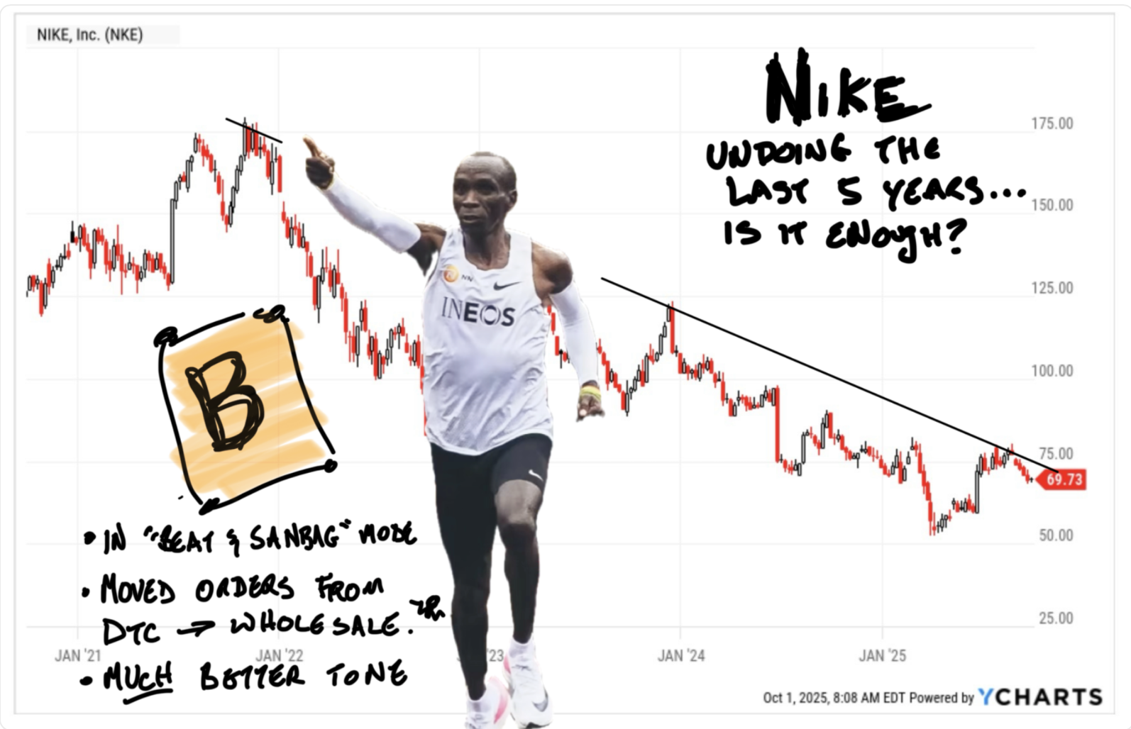 Yesterday, I discussed Nike reversing its 5-year strategy shift from wholesale to DTC. Last quarter, wholesale rose 7% while DTC dropped 12%. Hill is winning back retailers, but shifting revenue from a profitable channel is no major win.