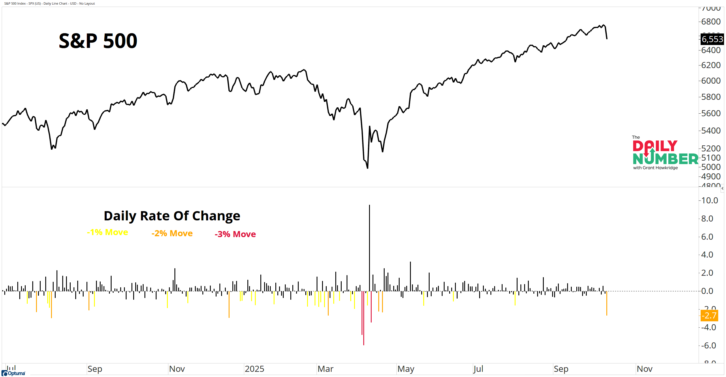 The bottom panel shows the daily rate of change. Each bar represents the one-day percentage move.