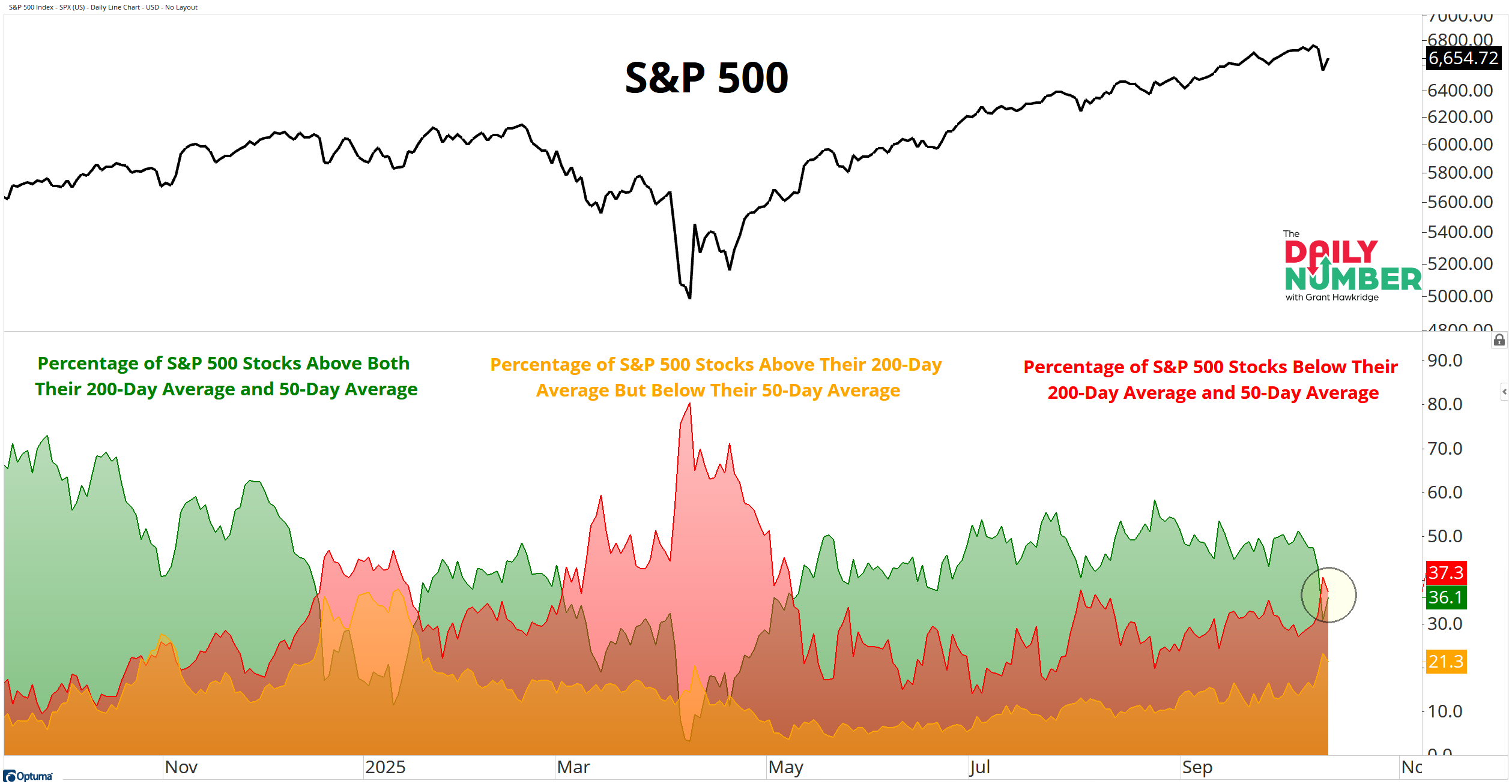 Right now, 36.1% of the index remains in full uptrends, 21.3% is in short-term pullbacks inside longer-term uptrends, and 37.3% has broken both trend lines. The balance of power has shifted, with more names losing structure than building on it.