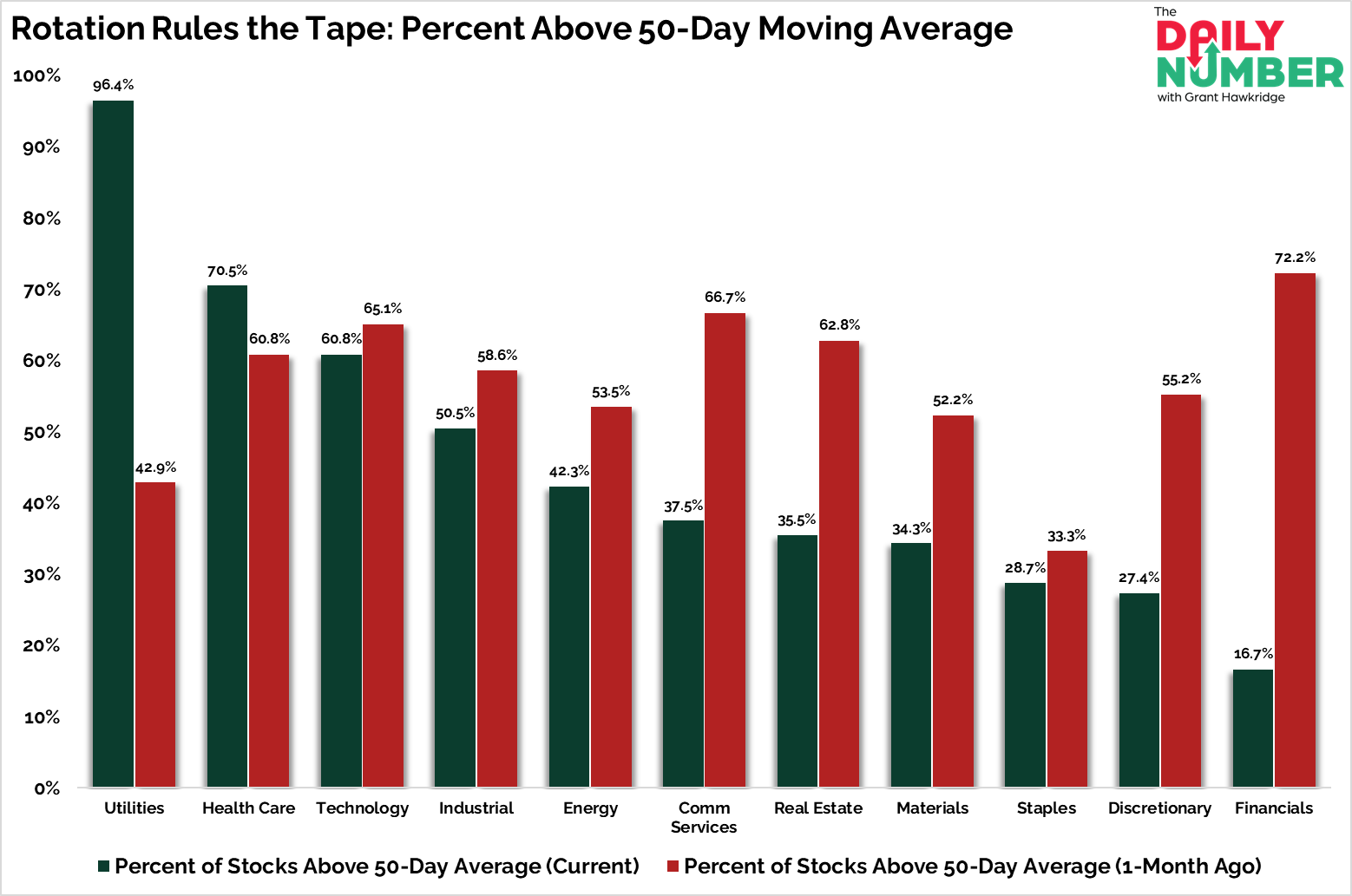 The Takeaway: Utilities lead the pack with 96.4% of stocks above their 50-day average, up from 42.9% a month ago. Health Care follows at 70.5%.