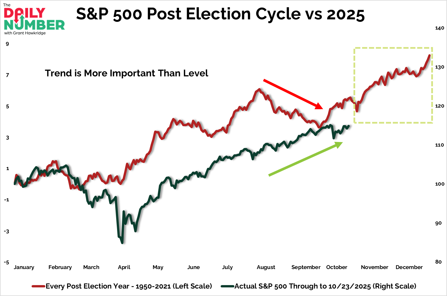 • The chart shows two lines comparing the S&P 500’s average post-election-year performance since 1950 (red) and its 2025 performance through late October (green).