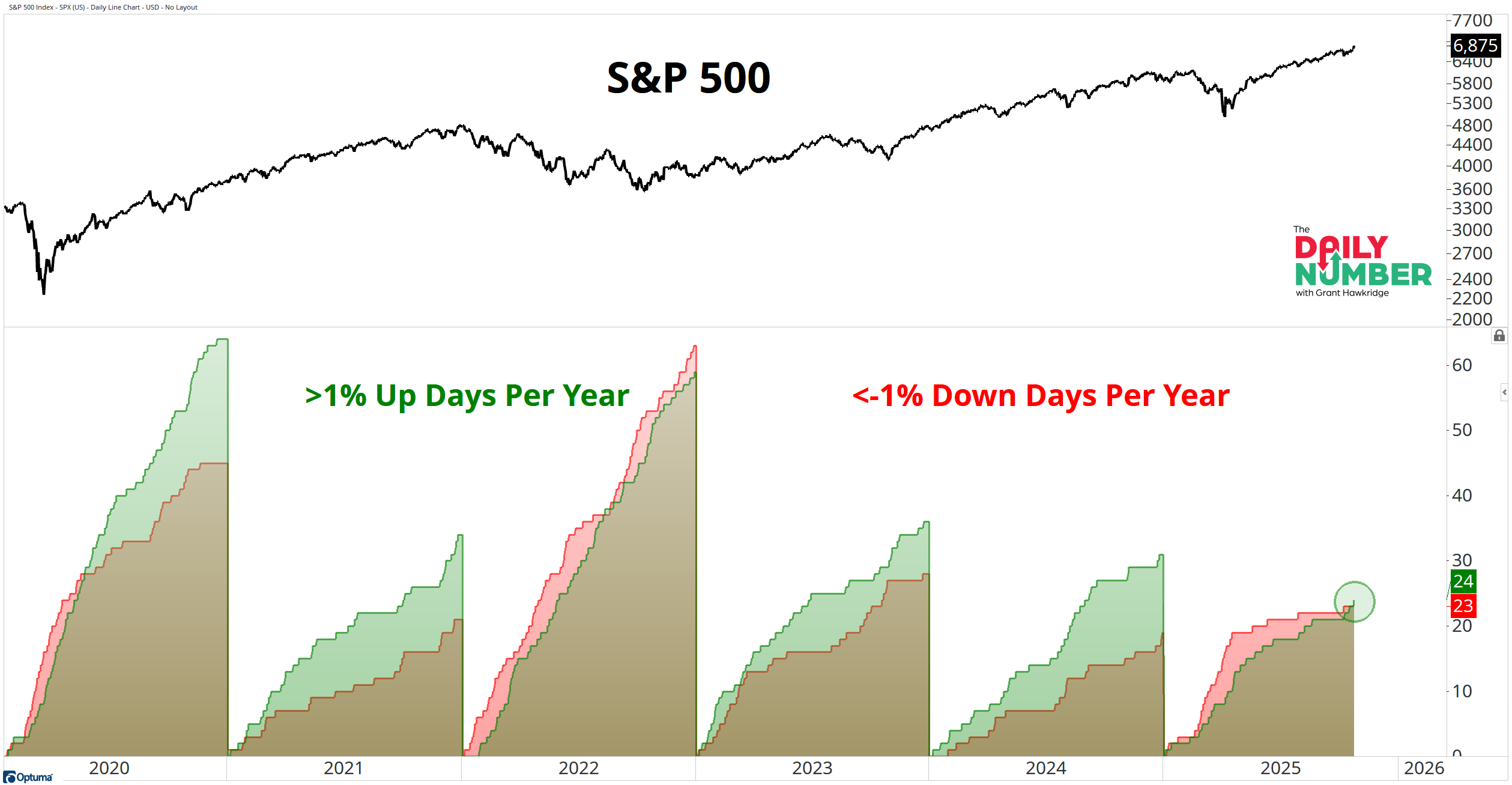 Years when large up days lead often coincide with steadier advances. It means volatility is leaning toward strength instead of stress.