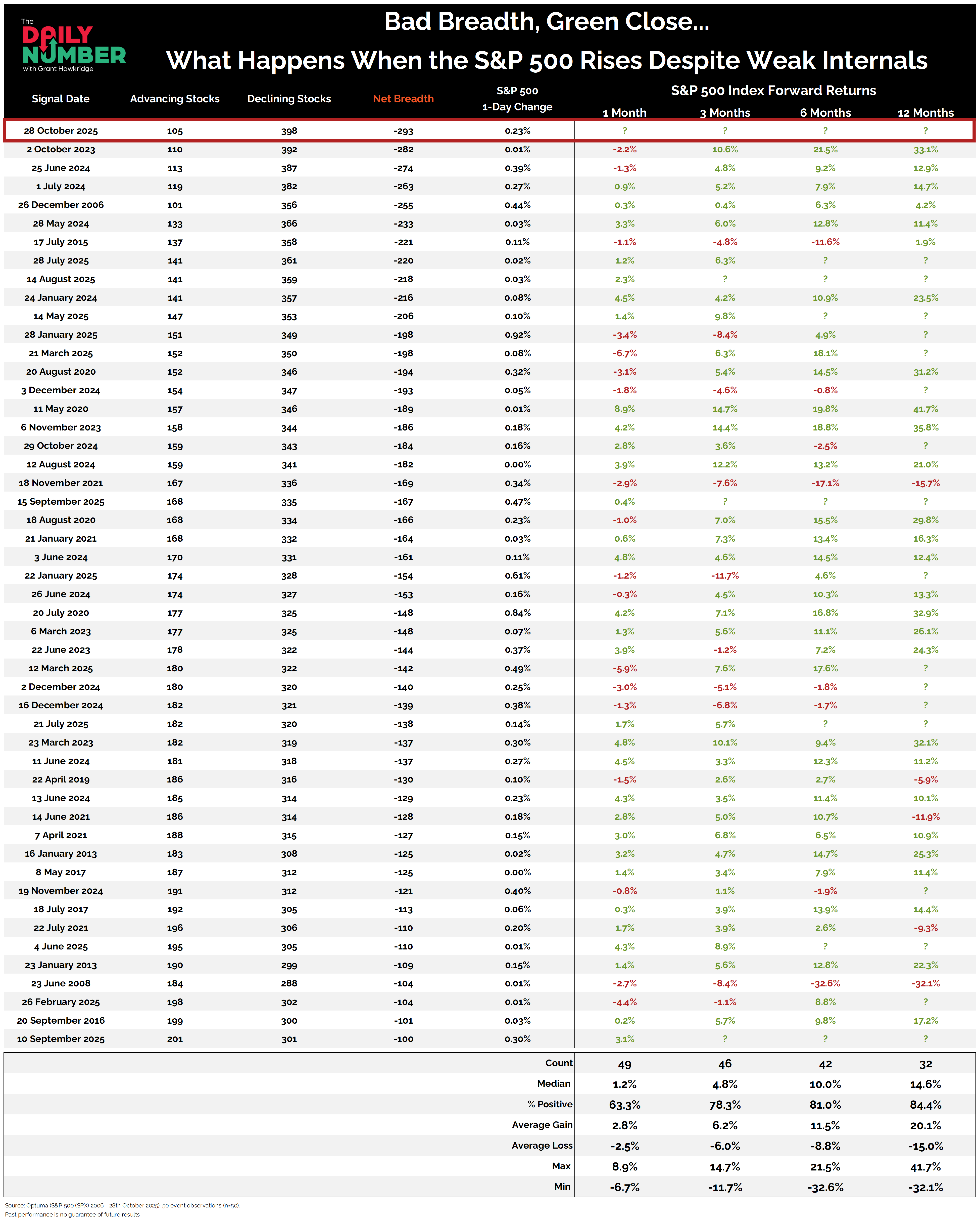 • The table lists 50 (276 total since 2006) of the most extreme cases where the S&P 500 closed higher despite negative net breadth. Each row shows the number of advancing and declining stocks, the daily change in the index, and the S&P 500’s forward returns over 1, 3, 6, and 12 months.