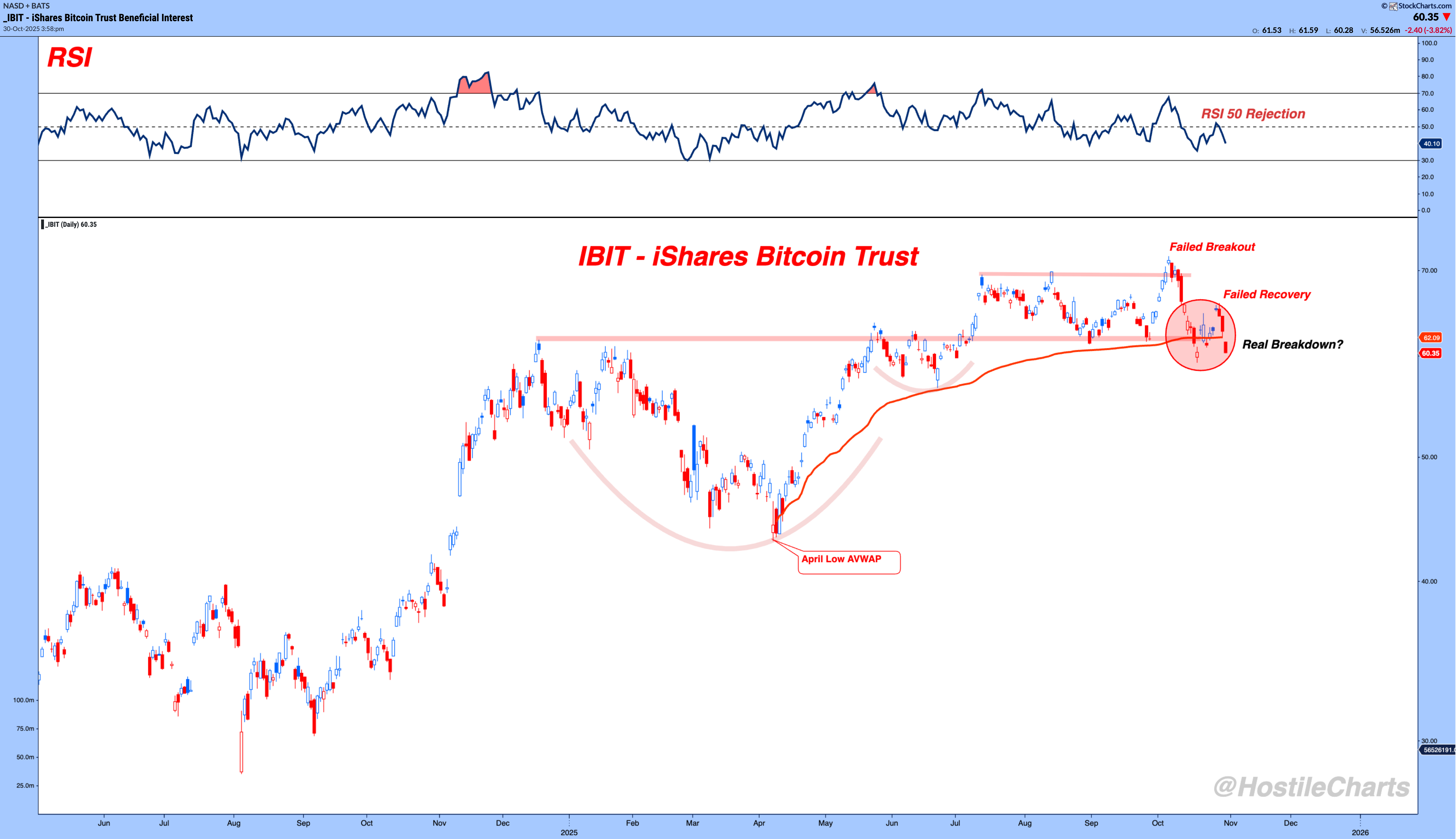 Thompson's Two Cents Bitcoin Looks Spooky The 4 Warning Signs By Larry Thompson October 30, 2025 The market speaks if you’re willing to listen.And its language is Price.Price holds the key. It’s never about one moving average or one indicator.It’s about the context of those tools relative to price itself.Right now, that message in Bitcoin isn’t sweet.Price is giving us 4 warning signs that this is looking more like a trick than a treat.Let’s start with the absolute chart of IBIT (iShares Bitcoin Trust). Warning #1: The failed breakout - buyers couldn’t sustain momentum above prior highs.Warning #2: The failed recovery - RSI barely reclaimed 50 before rolling over again. Momentum never flipped back to the bulls.Warning #3: Price has now broken below the April Low AVWAP, a key area where demand previously stepped in.That’s three strikes on the absolute chart.Then we look at IBIT relative to SPY and that’s Warning #4. The ratio is breaking lower with no major support until the spring lows. In plain English, Bitcoin is underperforming stocks and has room for that to continue. Could Bitcoin be setting up a fake-out before another run higher? Sure! Markets love to trick us before they treat us.But that’s not the bet worth making when the evidence says otherwise.For now, the message is simple: Let Bitcoin prove it deserves your capital before you hand it over.Anyways, that’s my two cents.Thompson's Two Cents Live!Friday 5pm ESTTomorrow I’ll be breaking down my favorite setups in the market.The ones no nobody's talking about but everyone will be chasing later.Set a reminder, catch it live, or watch the replay on YouTube. More from Thompson's Two Cents Larry Thompson The Sunday Stalk List | Ep. 21 A "SHOW ME" Market November 2, 2025 Larry Thompson The Rule vs. The Exception A Bull Market Chart October 28, 2025 Larry Thompson Don't Buy Fear I Got A Better Idea October 16, 2025 Sign Up TodayGet expert market insights delivered straight to your inbox. You must have JavaScript enabled to use this form. Email Address