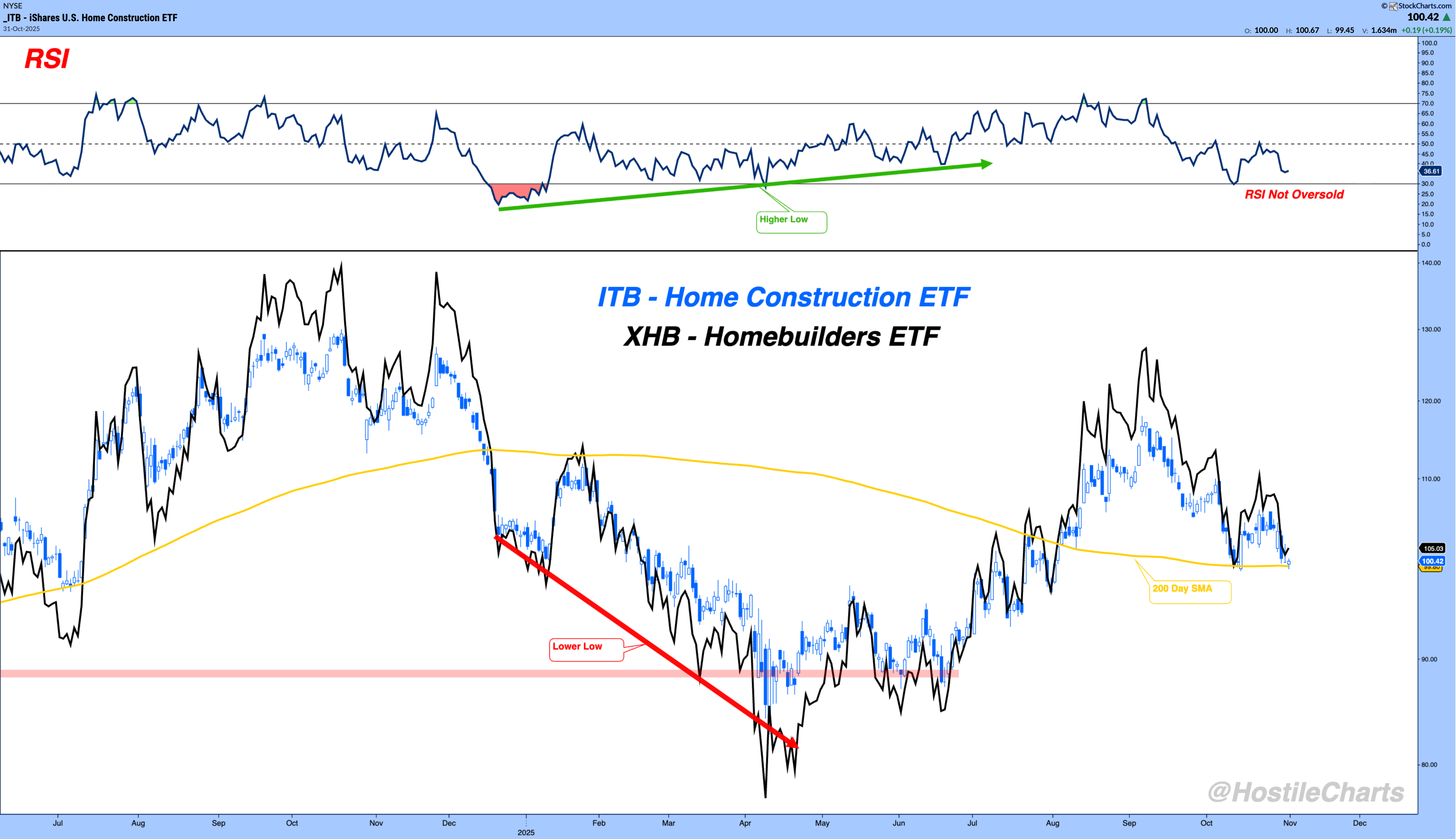 Housing stocks are sitting right at the 200-day SMA (~100 for ITB, ~105 for XHB).