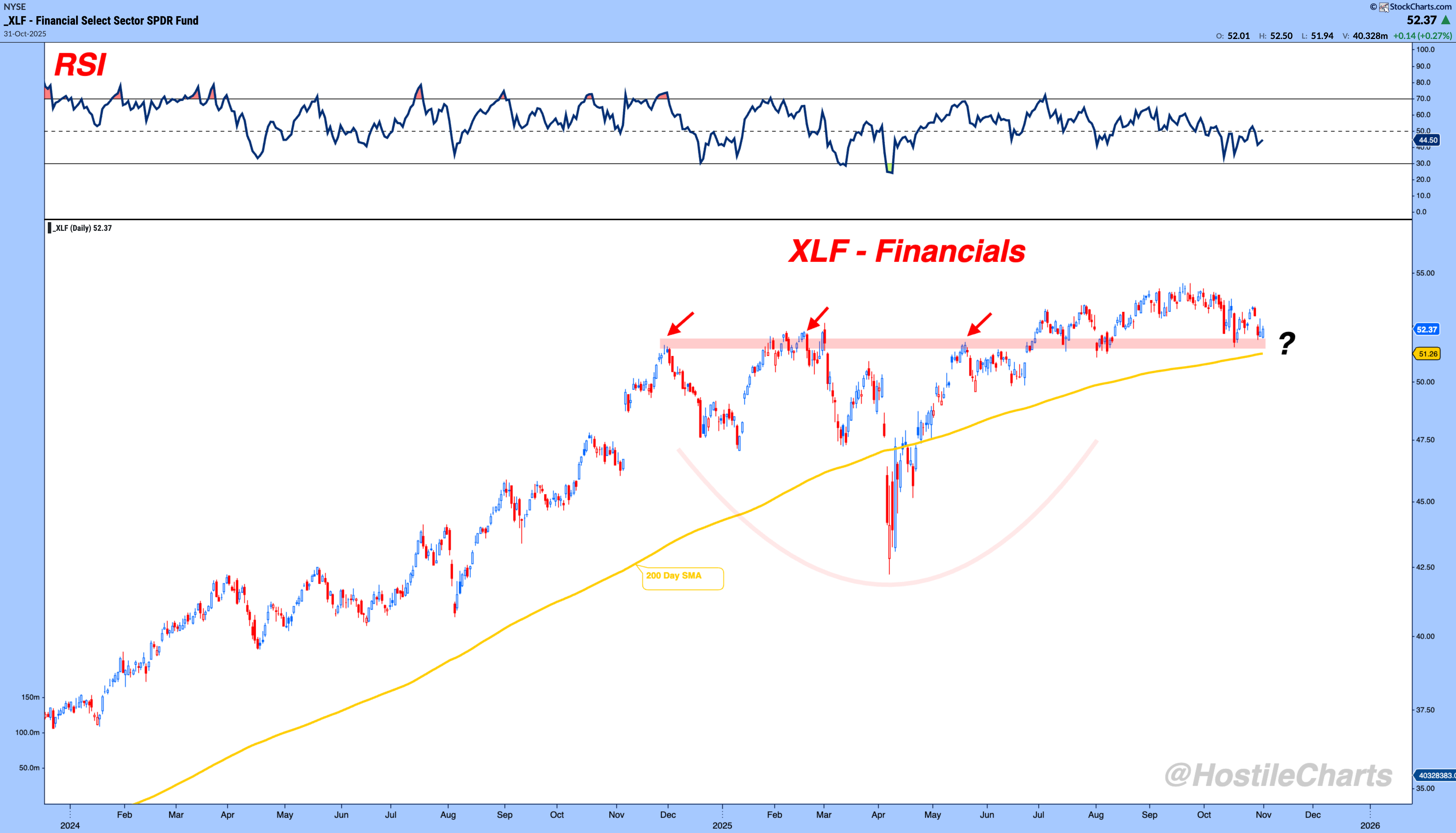 Financials are back testing the $51–52 zone, which lines up with former cycle highs and the 200-day SMA.