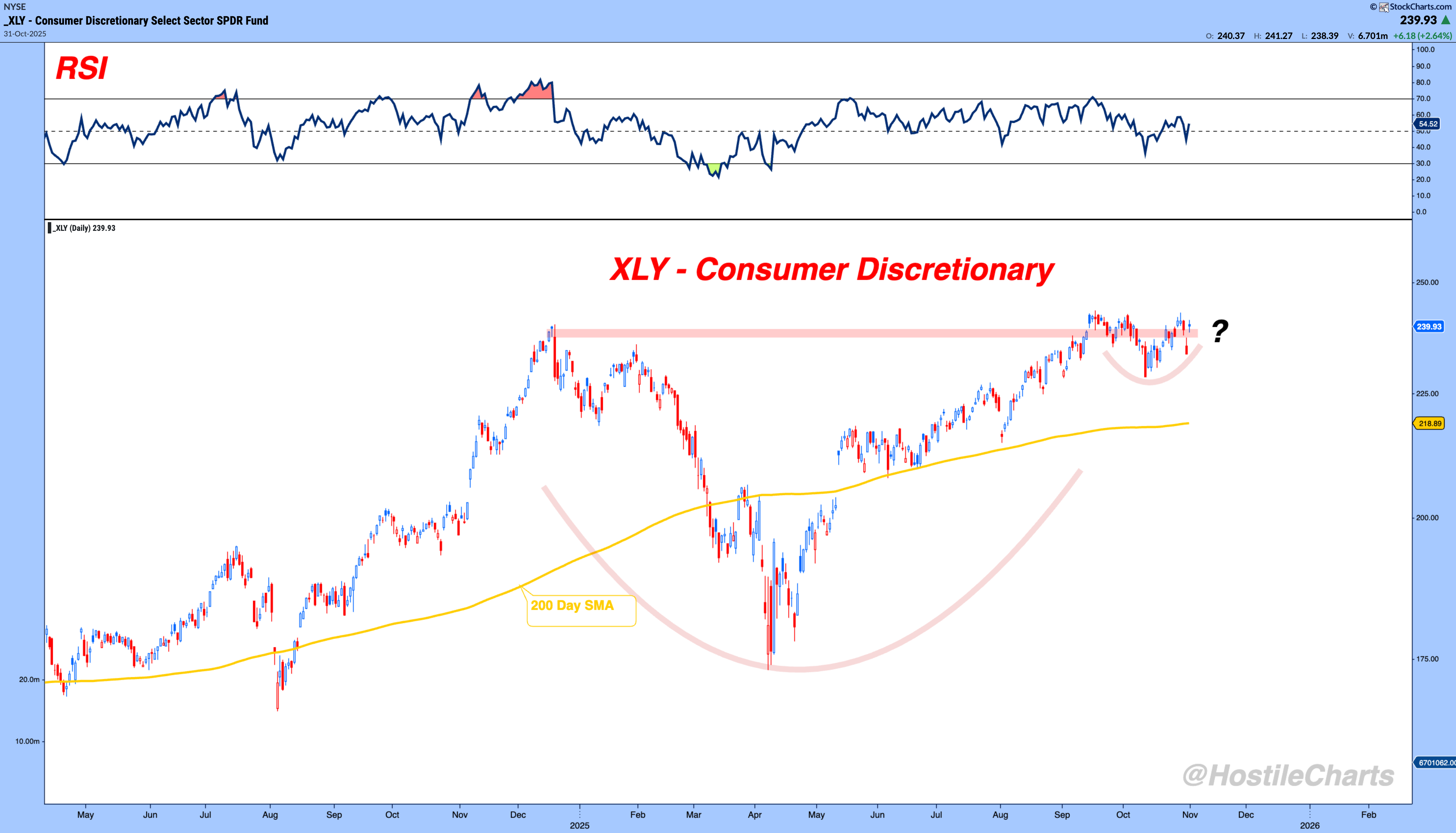 Right now, XLY is hovering near $240, testing the handle low and the 200-day down near $219.