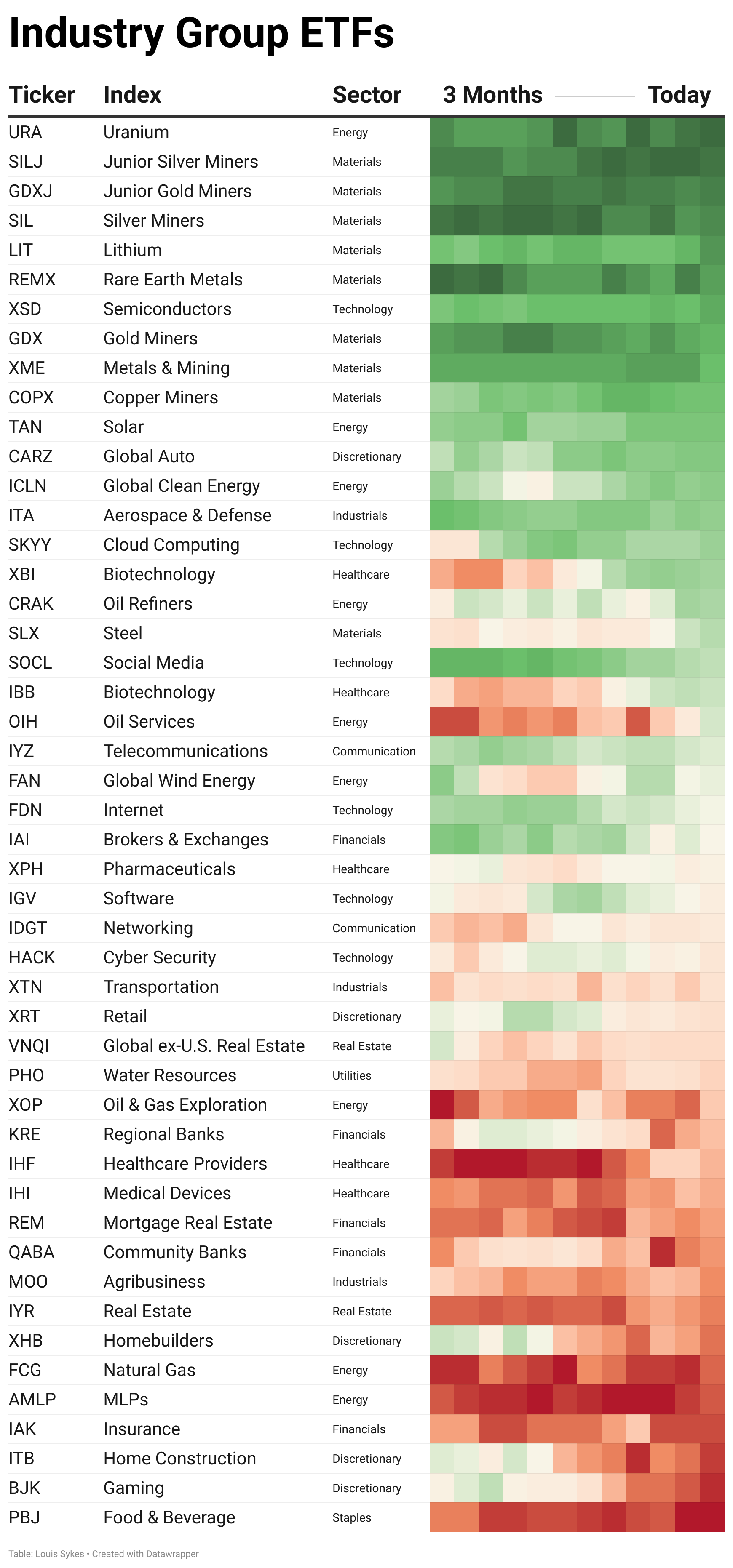 Looking at our industry group table, speculative stocks continue to top the rankings. However, two key risk-on barometers are sitting deep in the red, suggesting theyโre lagging in a meaningful way.