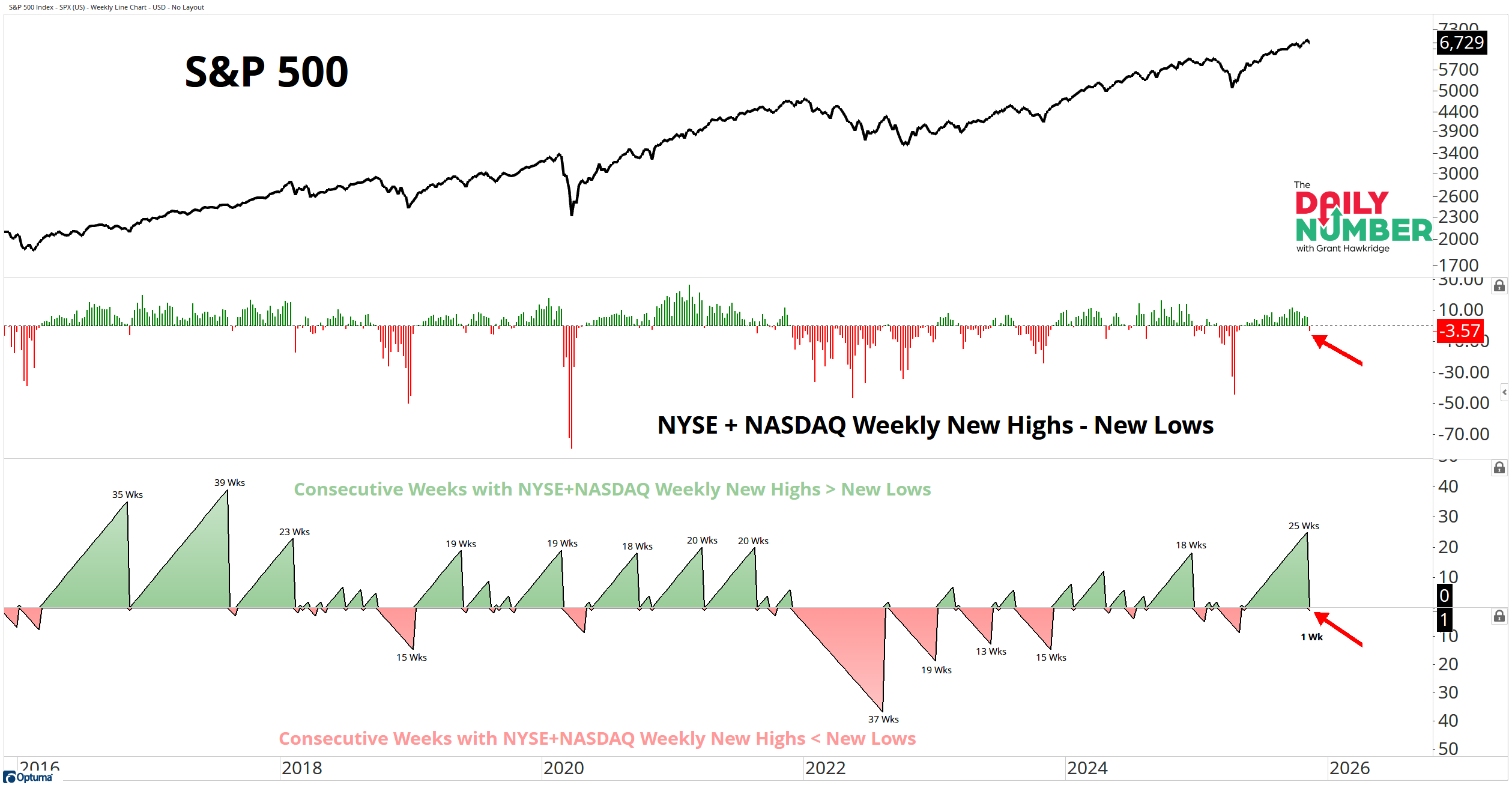 Breadth runs like this do not last forever. 25 straight positive weeks ranks among the strongest since 2017. When these streaks end, markets usually pause or digest gains rather than reverse outright.