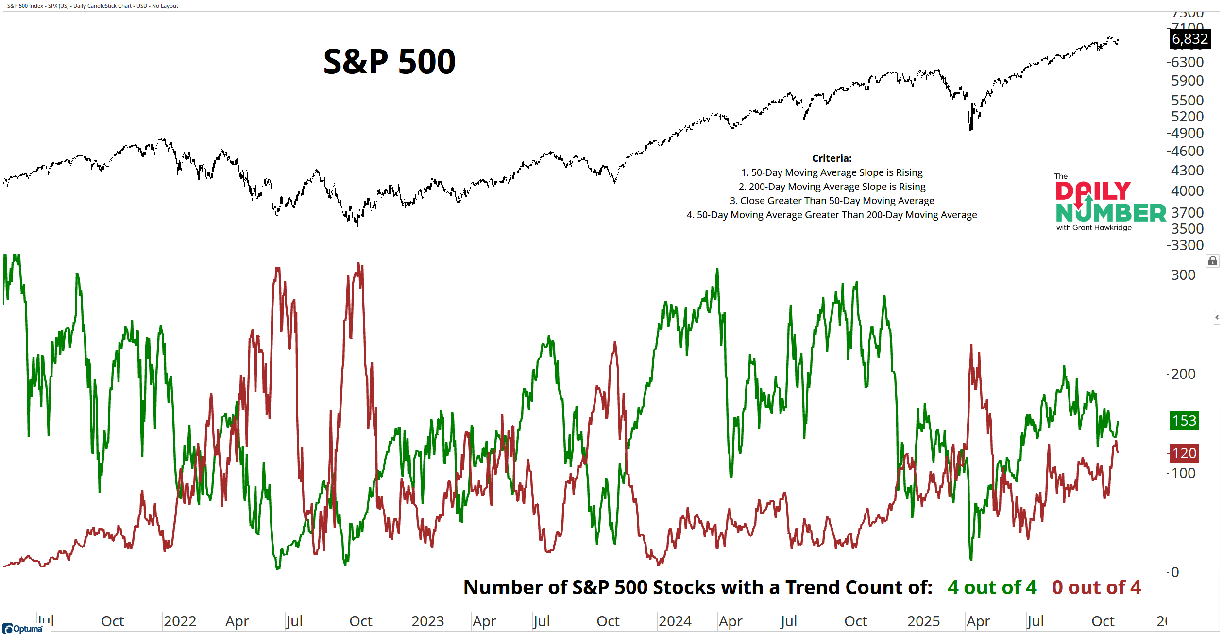 The count of S&P 500 stocks in full uptrends sits at 153, while 120 are in full downtrends.