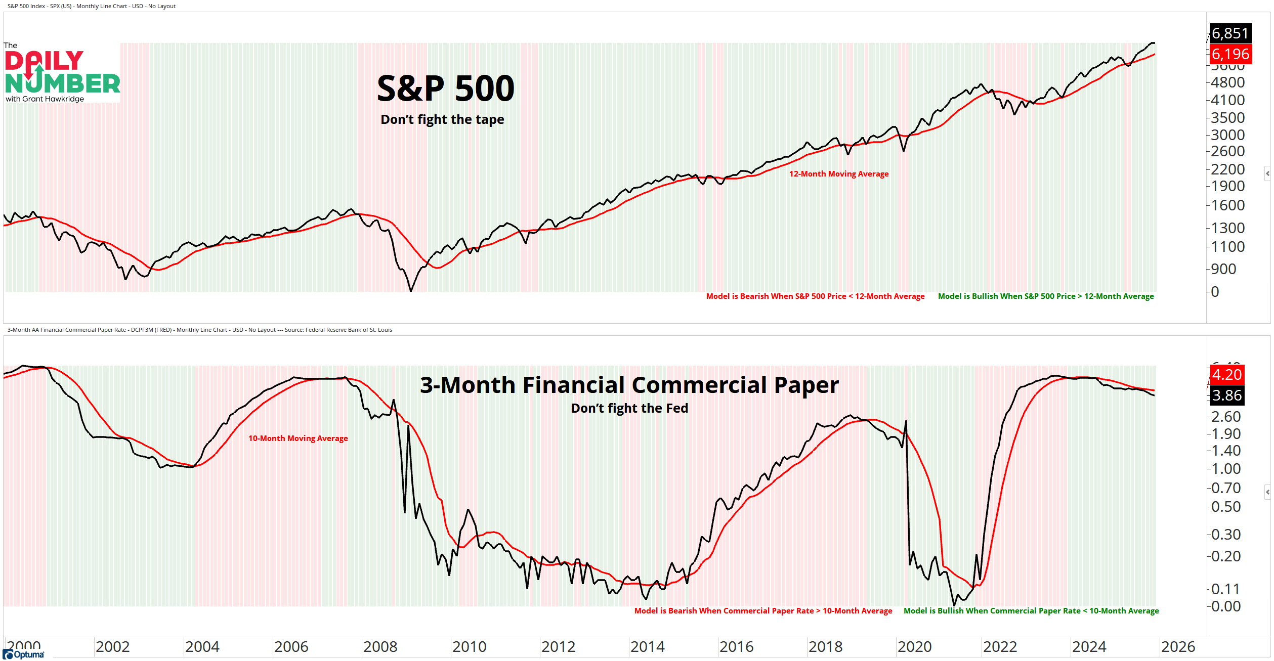 The bottom panel shows the 3-month financial commercial paper rate as a black line and its 10-month moving average as a red line. The background also shifts between green and red based on whether the rate sits above or below that moving average.