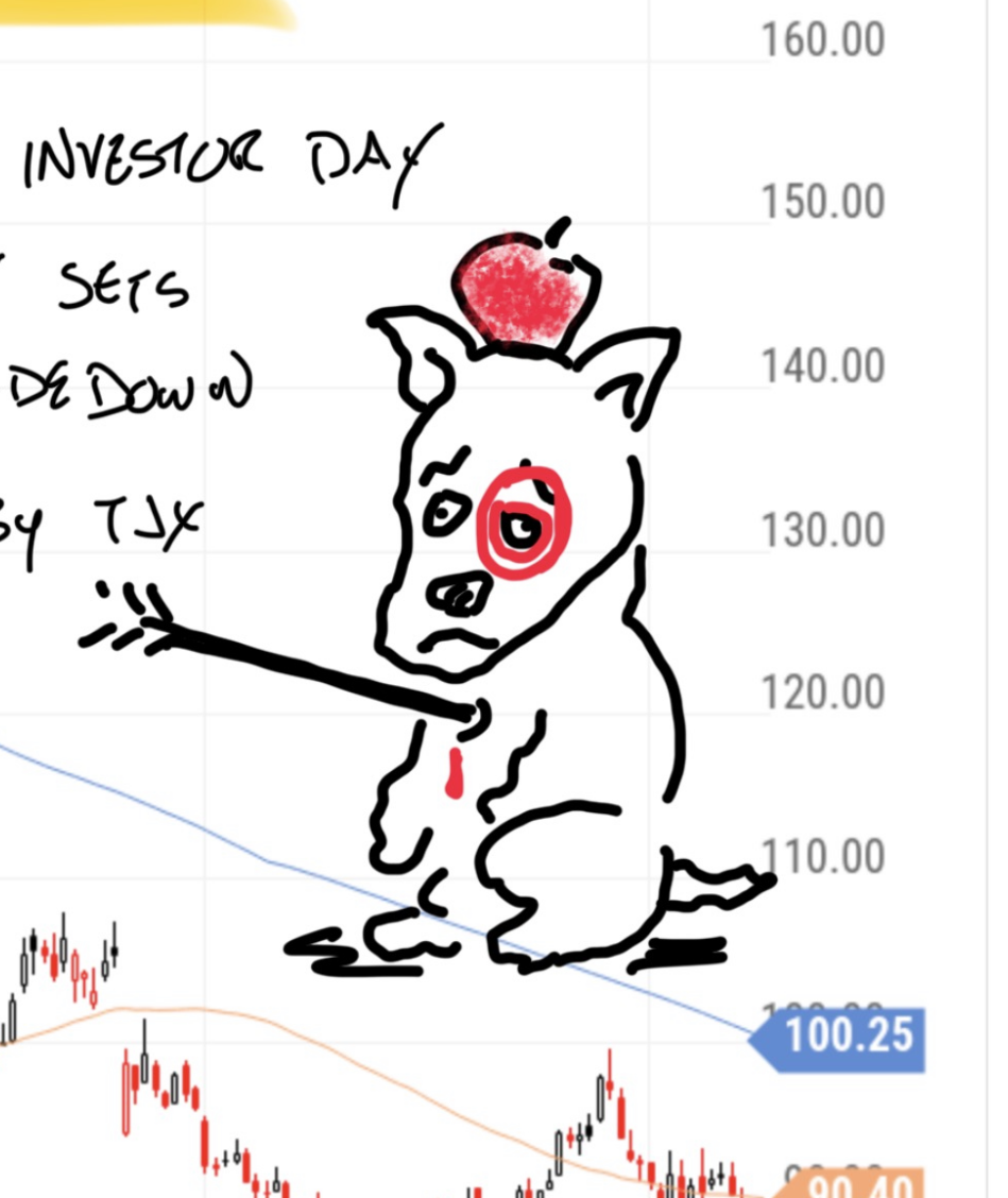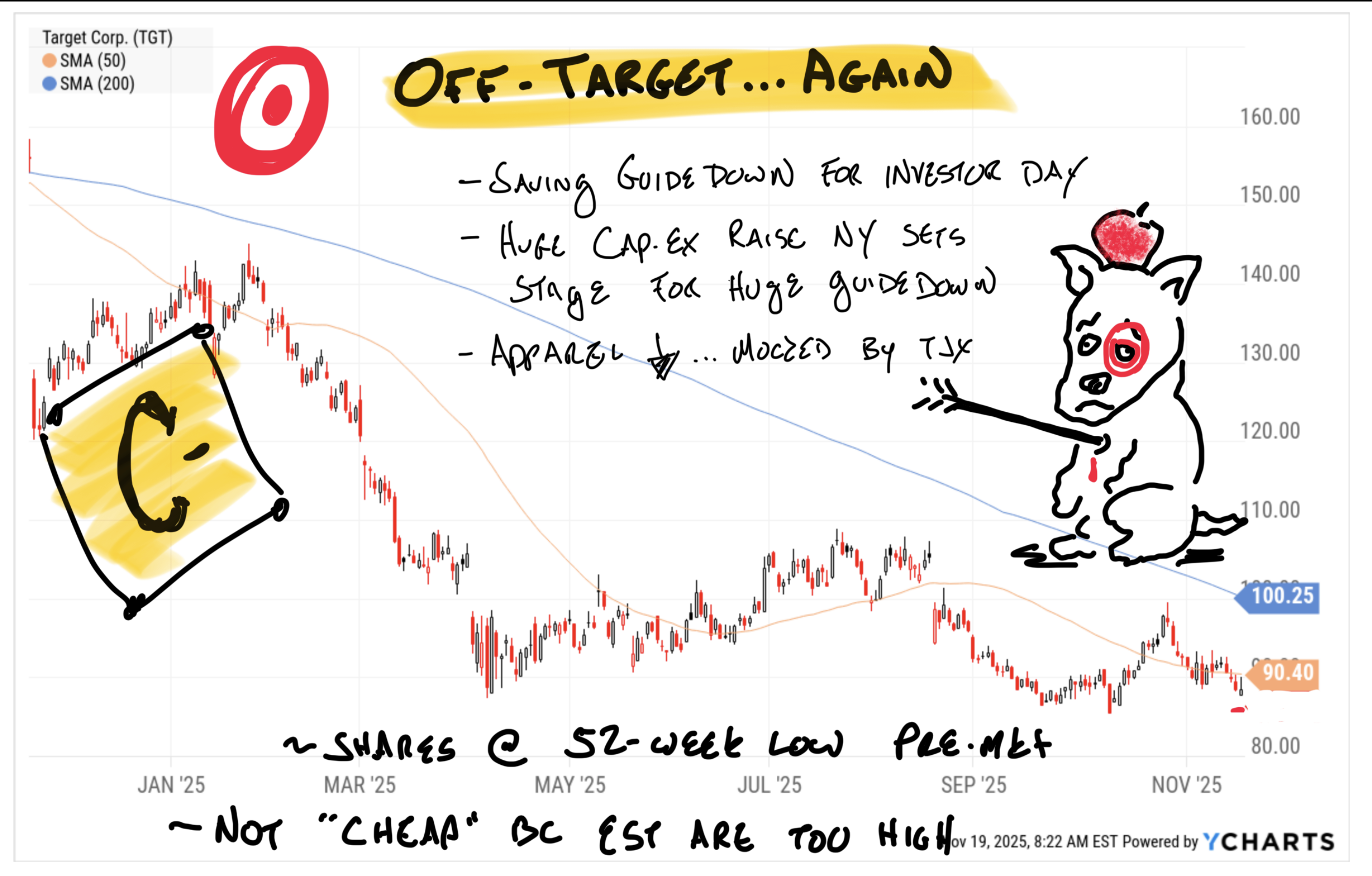 Translating from retail-speak, Target is still getting worse. New management plans to increase CapEx by 25% next year, bringing the total to $1b. As a low cash-flow operation, this means at least 2 things for next year. First, estimates are way too high for EPS and next year's sales. Second, F27 is make-or-break for Target. The balance sheet is fine, for now, but at 3.4% operating margins, Target would better deploy that CapEx productively.