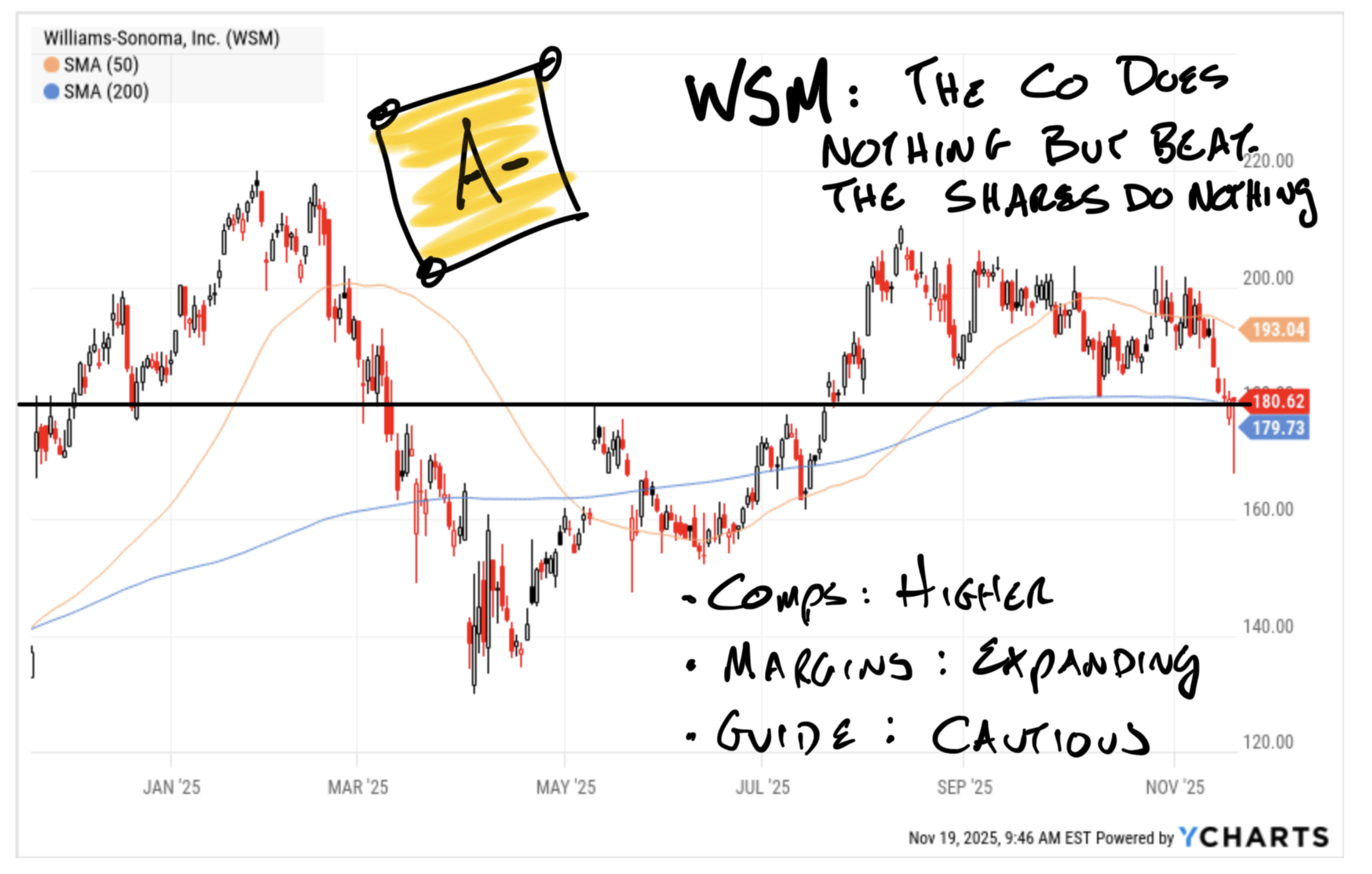 I’m a huge, unabashed fan of WSM CEO Laura Alber. The company beat across the board, expanding margins and posting 4% comp store sales. As feared (and why I sold the stock for the Portfolio+), guidance was cautious, essentially because what the hell else is a company selling housewares and furniture imported from around the world (including China) going to say?