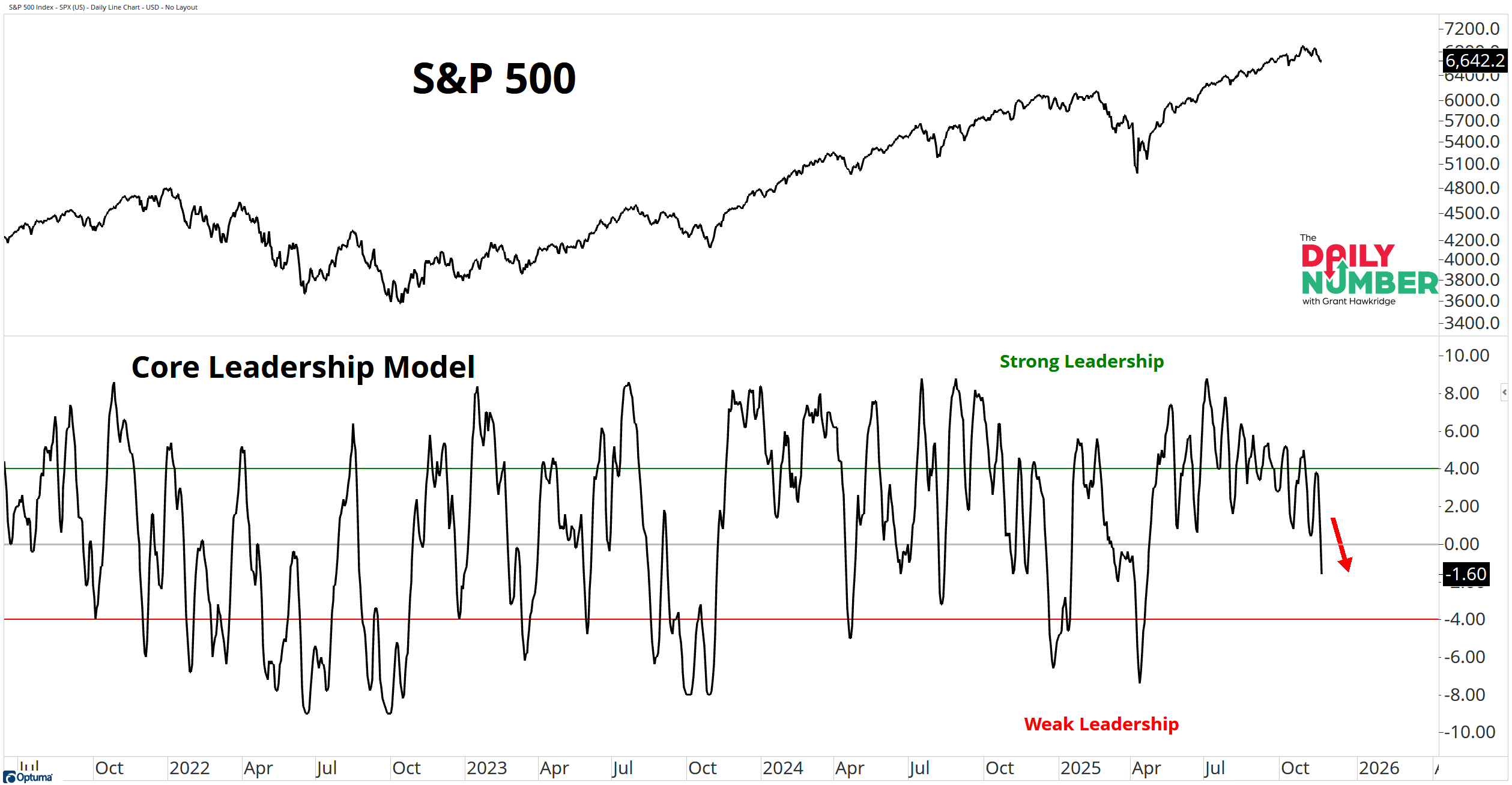 My Core Leadership Model, the composite that blends short, intermediate, and long-term breadth, has slipped back under zero and is moving toward the weak leadership zone.