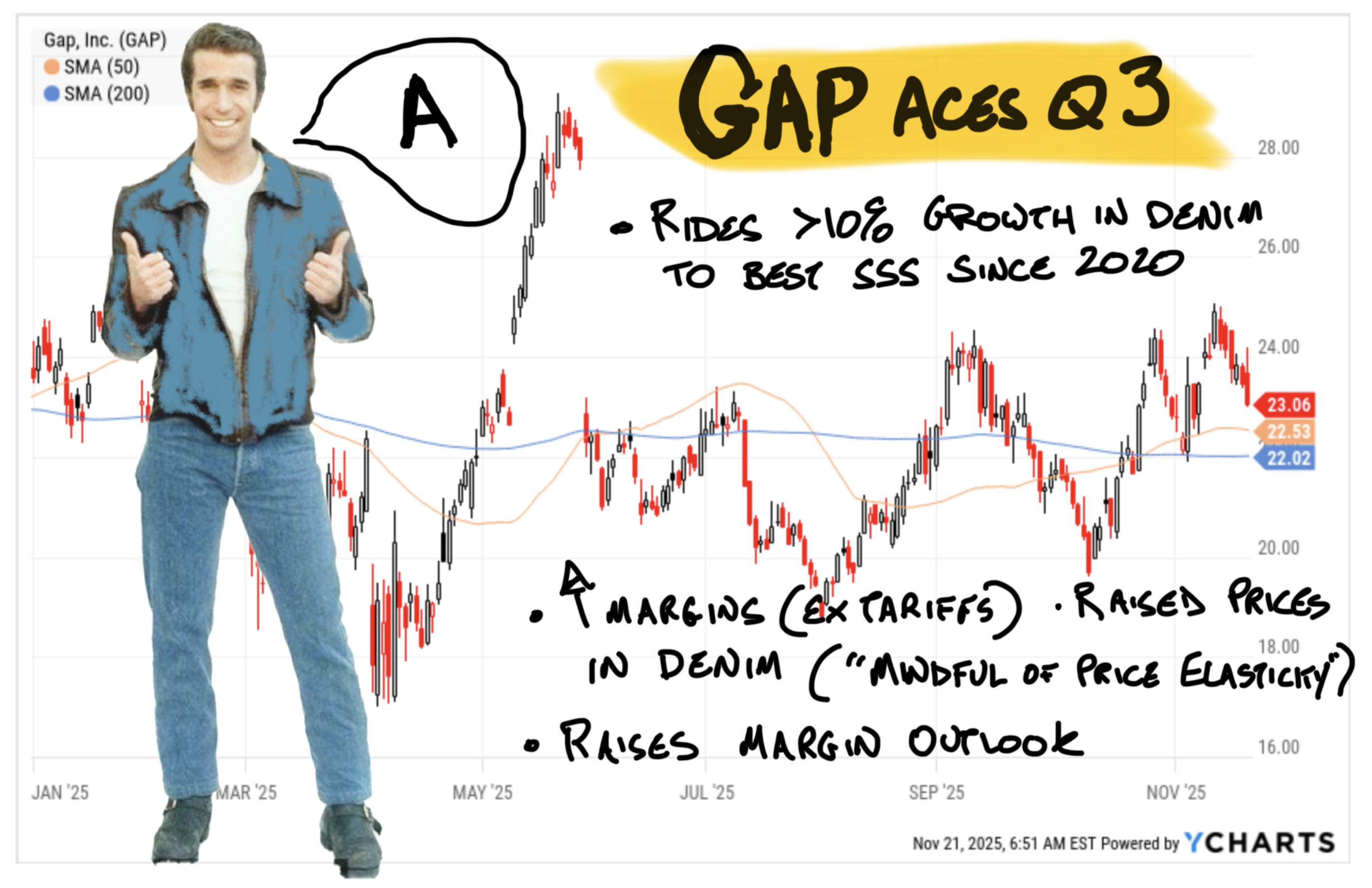 In a bullish market, Gap shares would fill the gap in the chart up to $28. In this week's market, $GAP is up about 5%. In the words of the POTUS, “no crying in the casino”. This was a great quarter from the largest specialty clothing merchant in America. Gap confirmed what we saw from Walmart, TJX, and Williams-Sonoma earlier in the week: consumers are being “choiceful,” but chains that give shoppers what they want at a good price are able to turn in solid results.