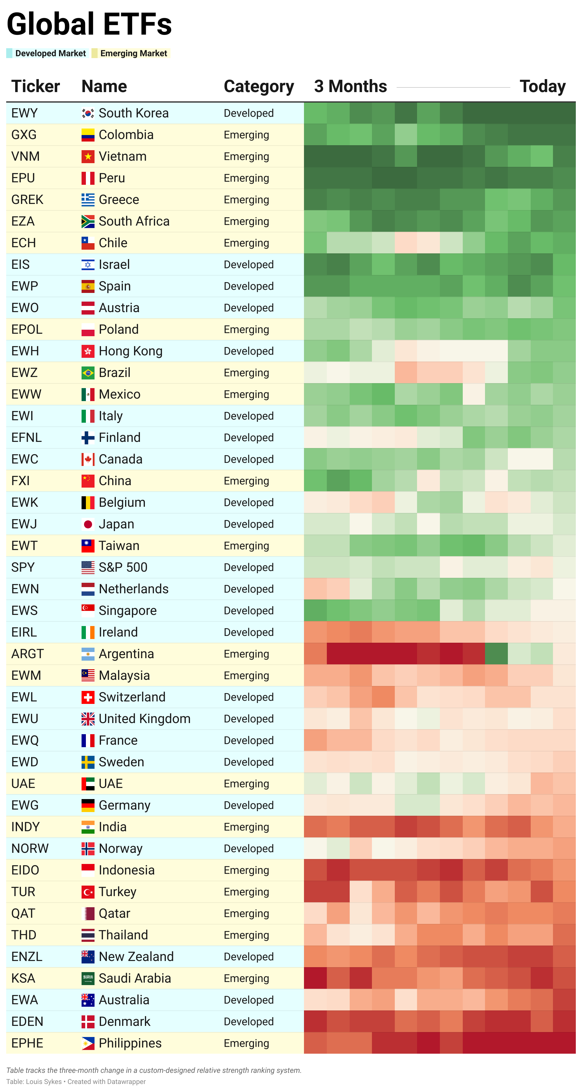 Looking at our international table, the S&P 500 sits roughly in the middle of the pack. That means more than half of the countries with a listed, diversified ETF are currently outperforming the United States by our system.