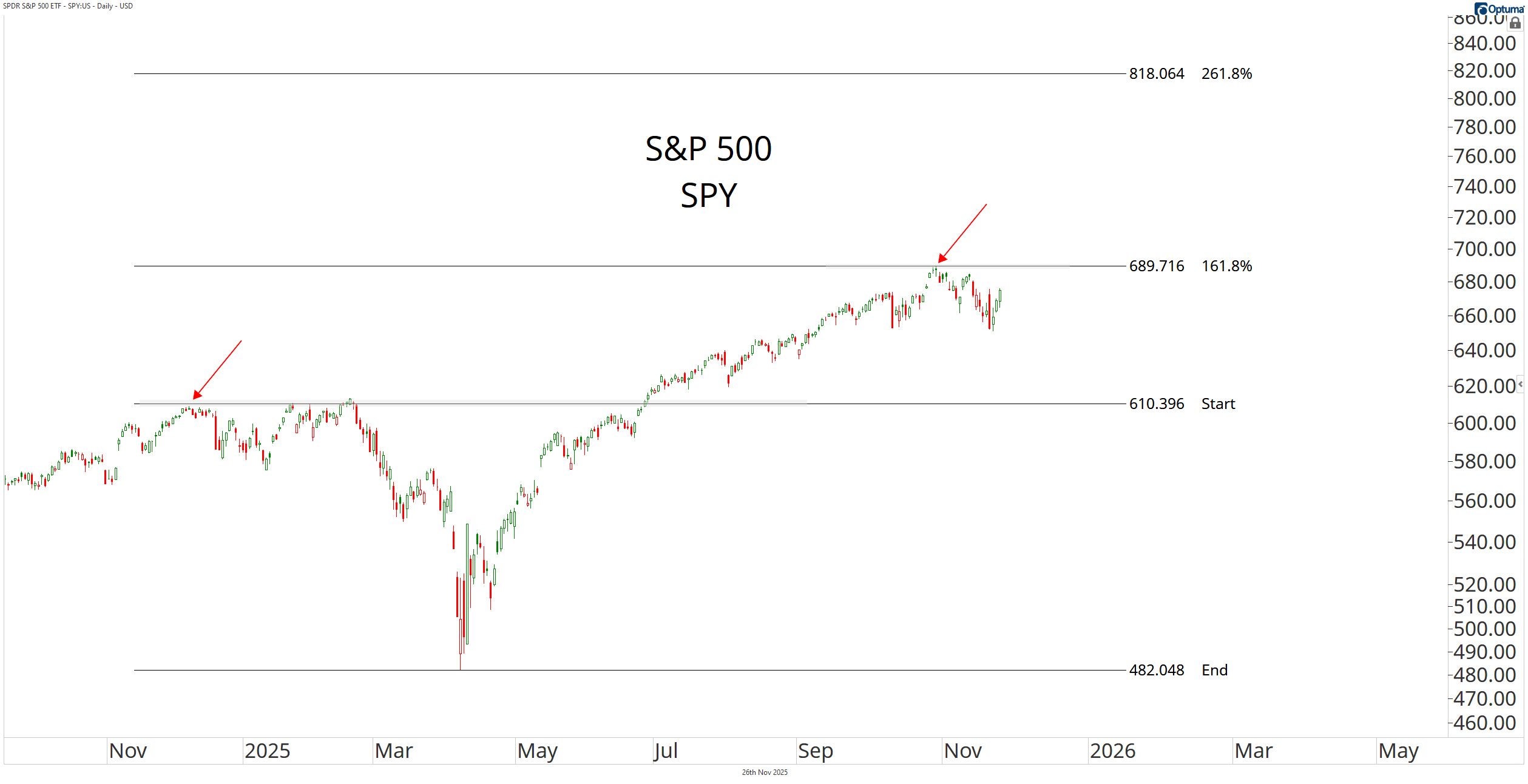 The key level to watch now is the former highs, which line up with the 161.8% Fibonacci extension from the Liberation-Day correction. This remains the most important decision point on the chart.