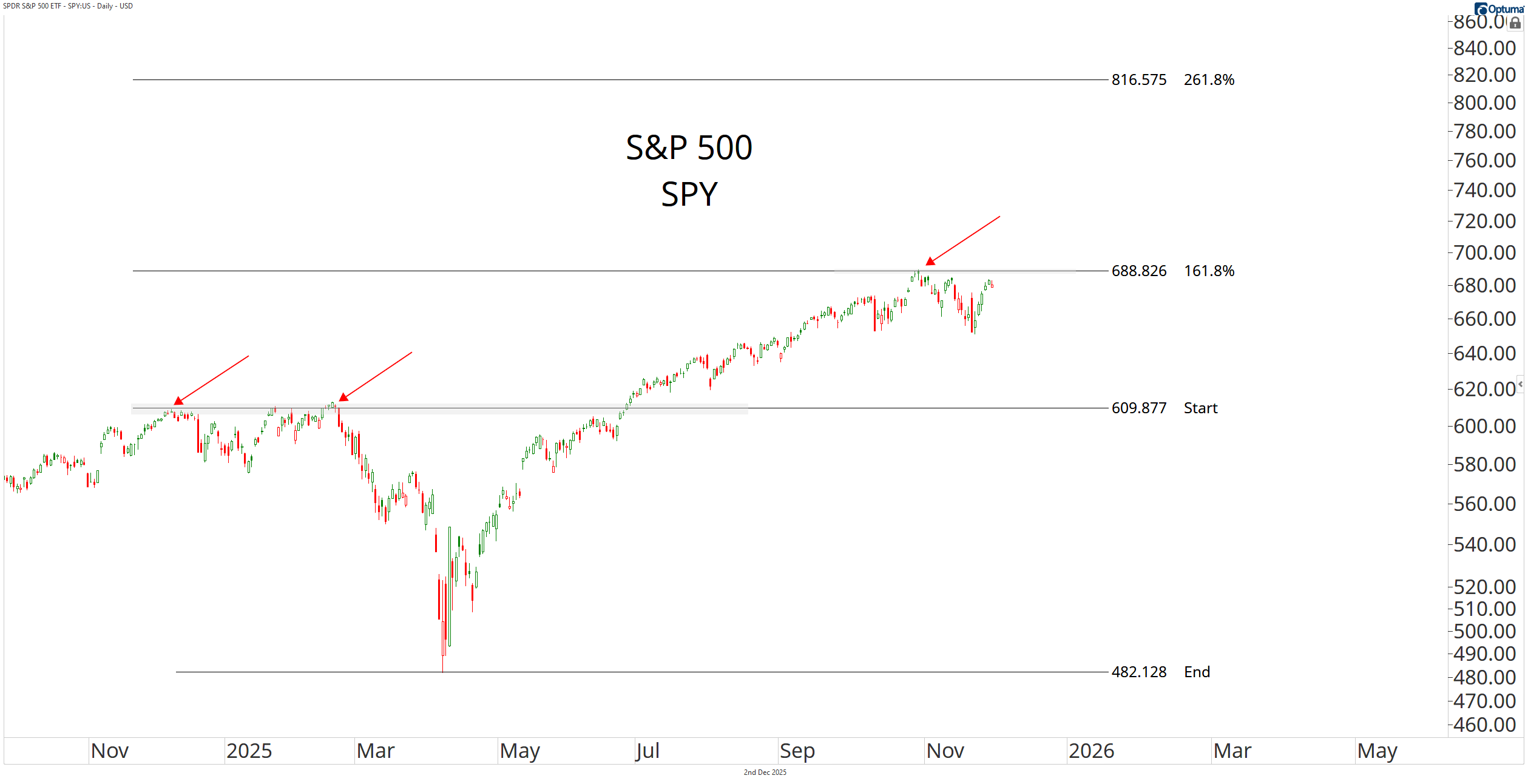 The broader market began its correction shortly after the S&P hit its 161.8% extension from the decline earlier in the year; if SPY can reclaim its former highs, the new target sits at 815.