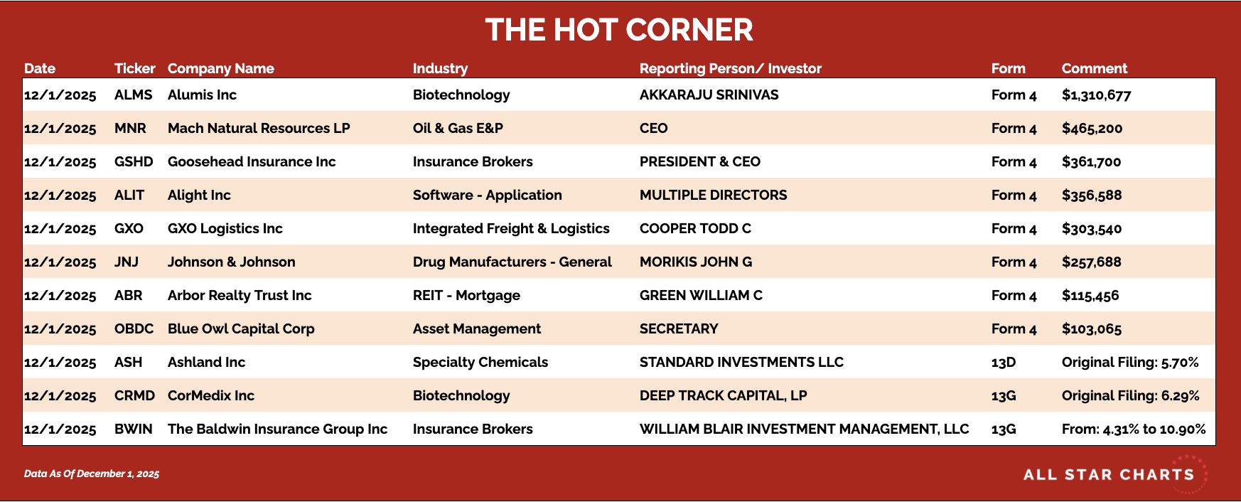 Hereβs The Hot Corner, with data from December 1, 2025: