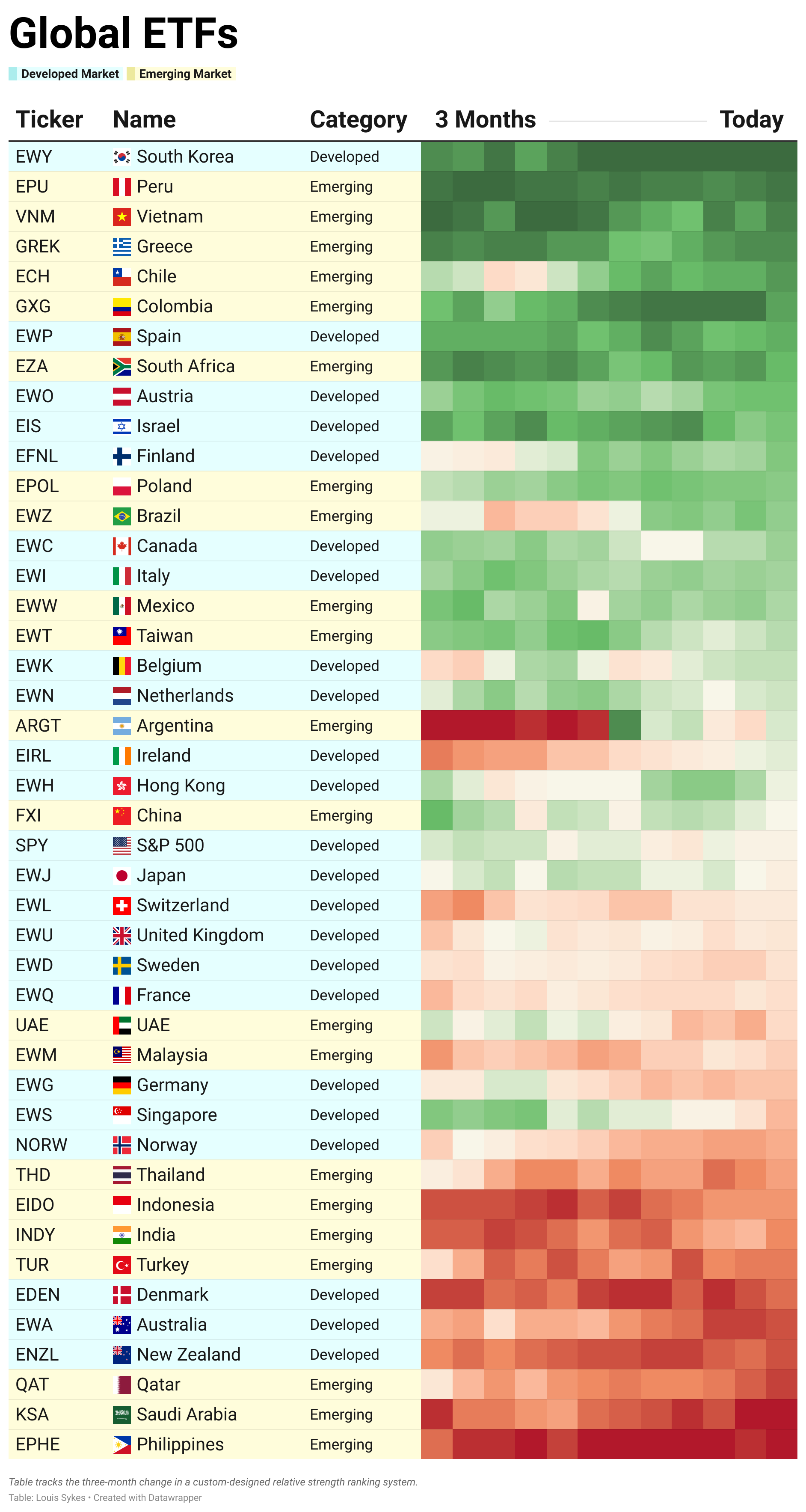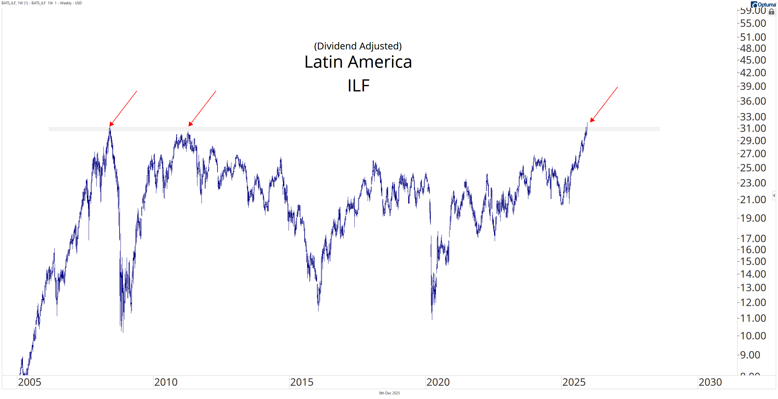 More recently, Latin America has shown strength. The iShares Latin America 40 ETF $ILF just closed at all time highs on a total-return basis for the first time in 17 years!