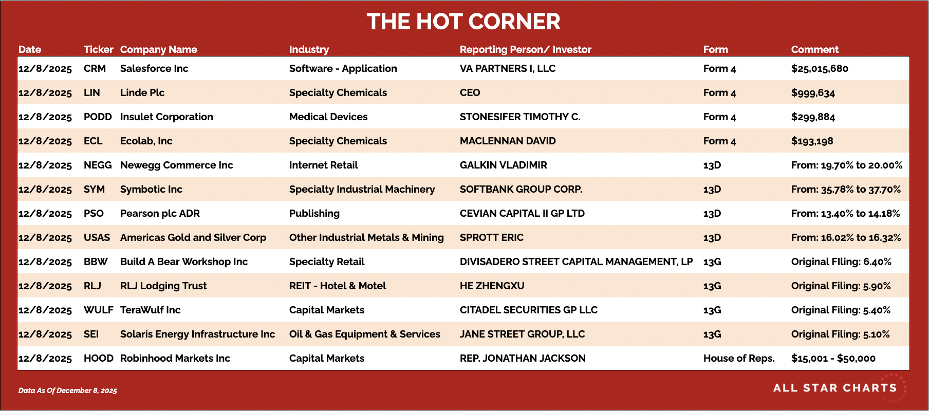 Hereβs The Hot Corner, with data from December 8, 2025: