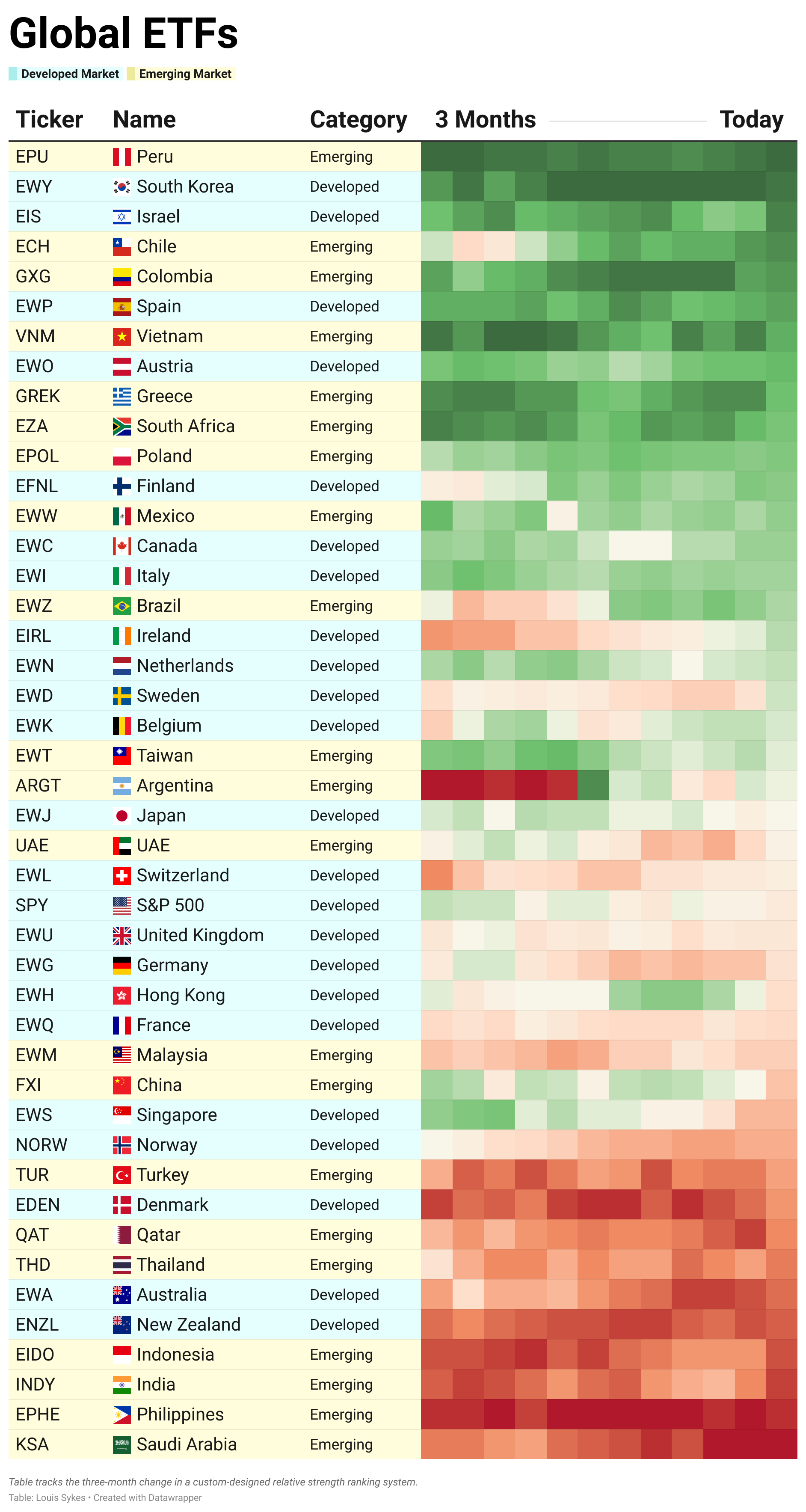 Peru $EPU sits at the top of this week’s table. After breaking out to new all-time highs, EPU has moved decisively into price discovery.