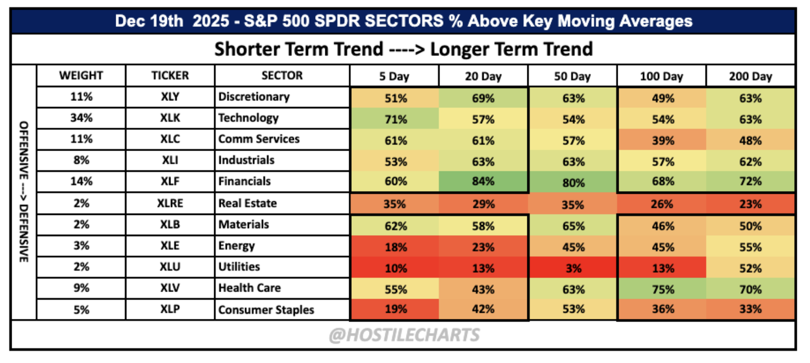 Breadth is taking a breather on a short-term basis, with week-over-week moderation across the 5-day and 20-day windows. That’s a healthy reset after a strong run, not a breakdown, as intermediate and longer-term breadth remains constructive, particularly with Financials, Health Care, and Industrials maintaining solid participation above their 50-, 100-, and 200-day averages.