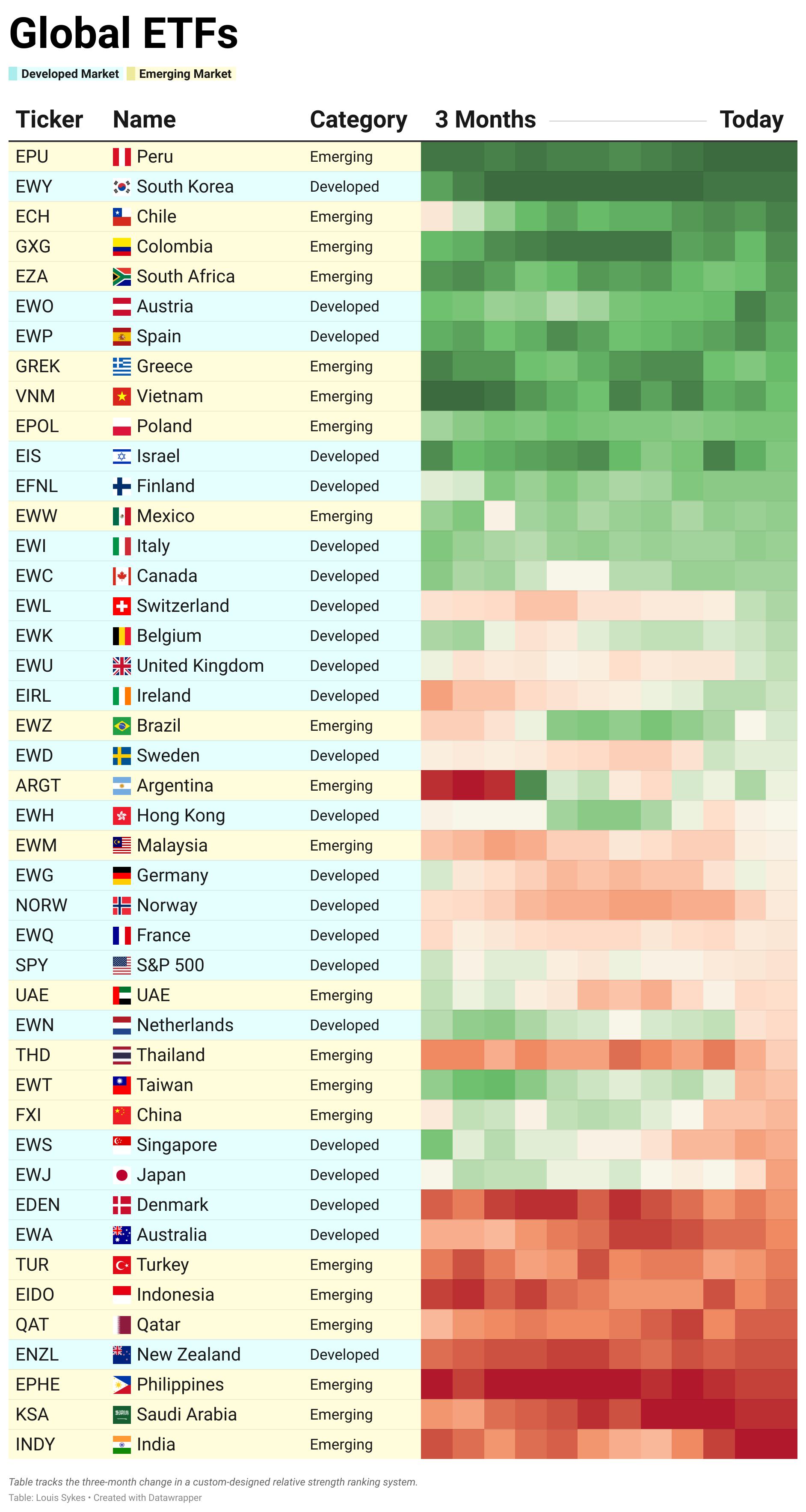 Throughout the entire year, we've been commenting on the outsized performance from markets outside the United States. Wrapping up this year, this same theme remains true, with the S&P 500 falling outside the top half of this week's global ETF table.