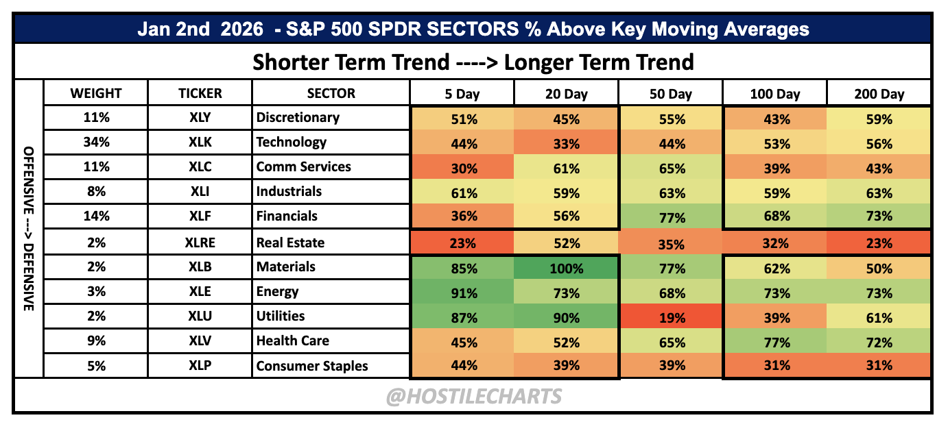 Week over week, short-term breadth cooled across the offensive complex, most notably Technology and Communication Services. That shows up clearly in the 5–20 day columns and looks like normal digestion after a strong run, not structural damage. More importantly, rotation is flowing into economically sensitive areas like Financials and Industrials, where longer-term participation remains firm. When leadership rotates within cyclicals, it usually tells you the breather elsewhere is just that, a breather, not the start of something more sinister.