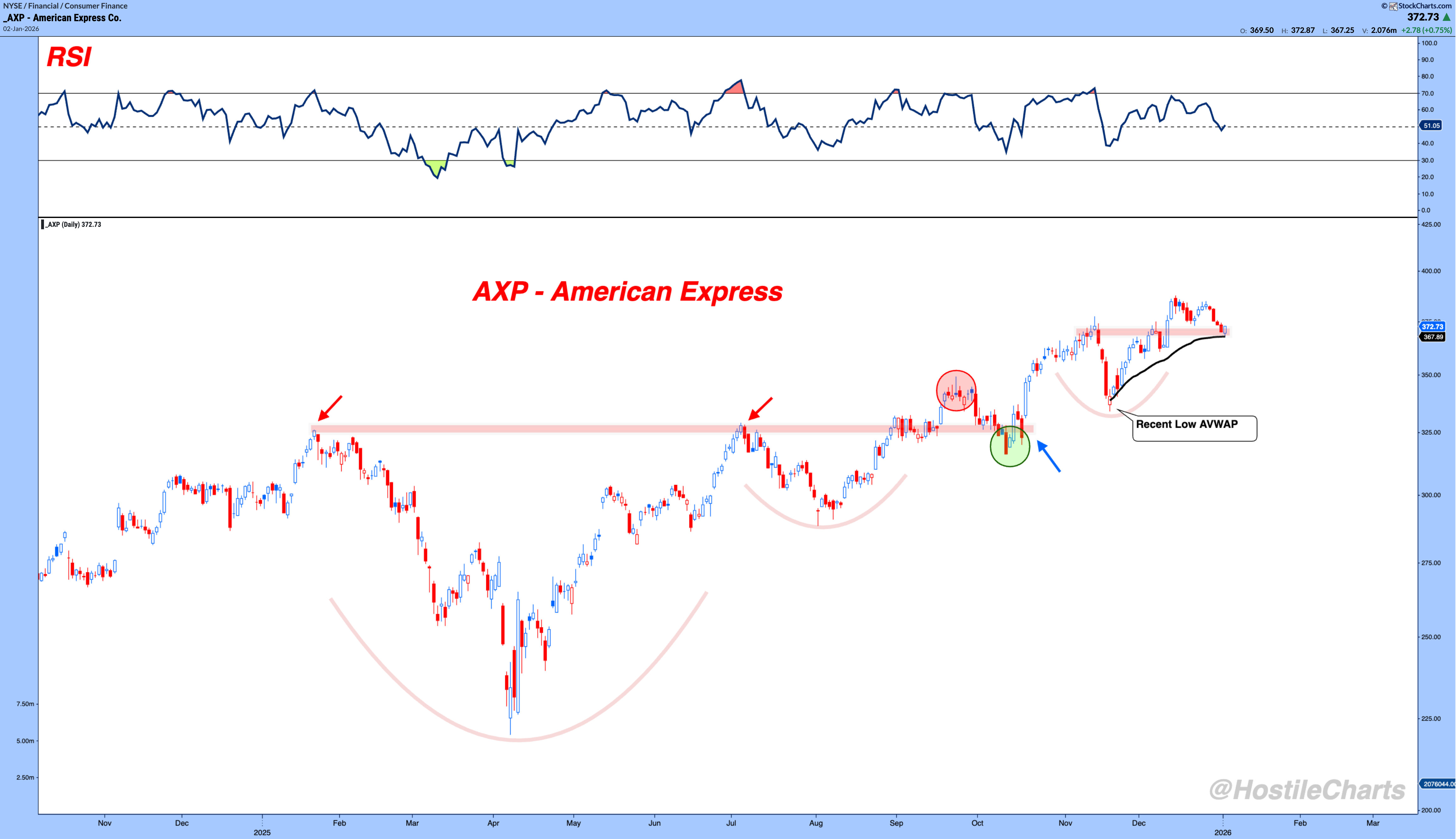 American Express is another consumer finance name acting right, consolidating above its recent breakout and holding VWAP support.