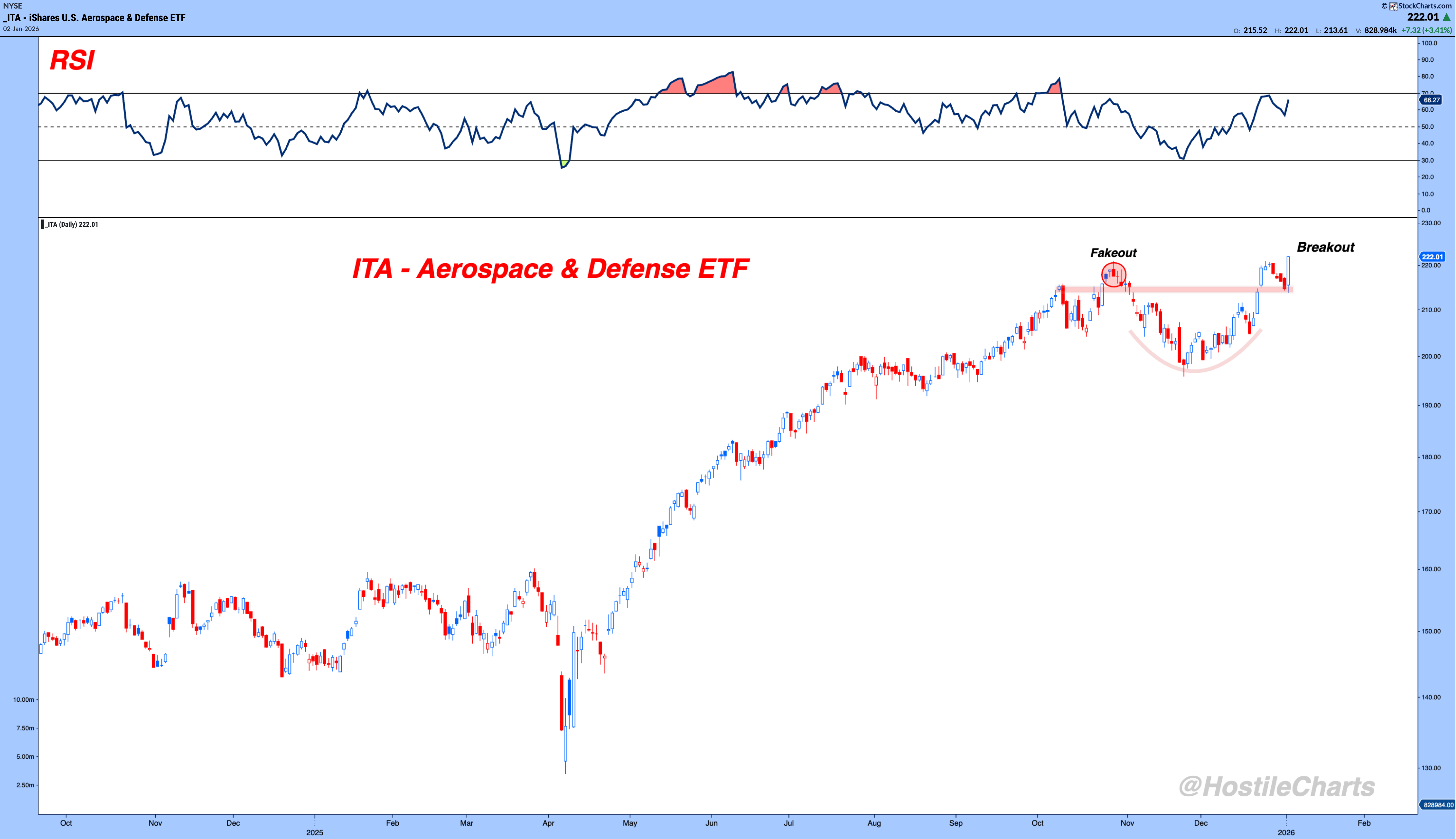 Defense continues to lead within Industrials, with ITA breaking higher after a failed breakdown.