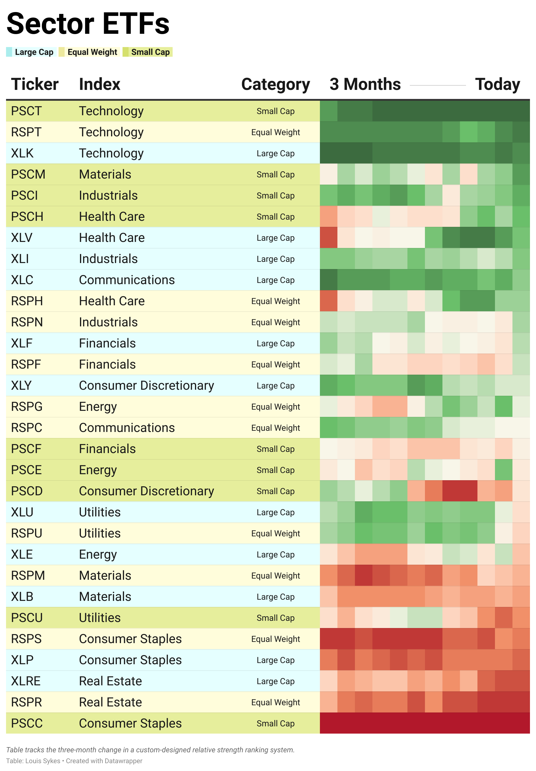The only exceptions here are the defensive sectors which find themselves at the bottom of the table; Consumer Staples $XLP and Real Estate $XLRE.