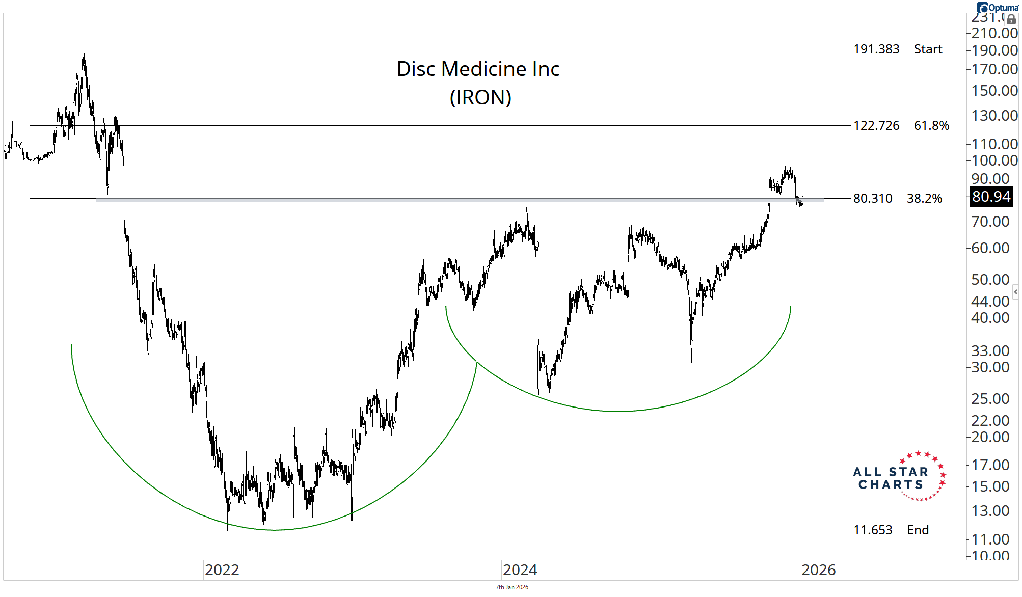 Disc Medicine is in the process of completing a massive SPAC base, with price retesting the 38.2% Fibonacci retracement.