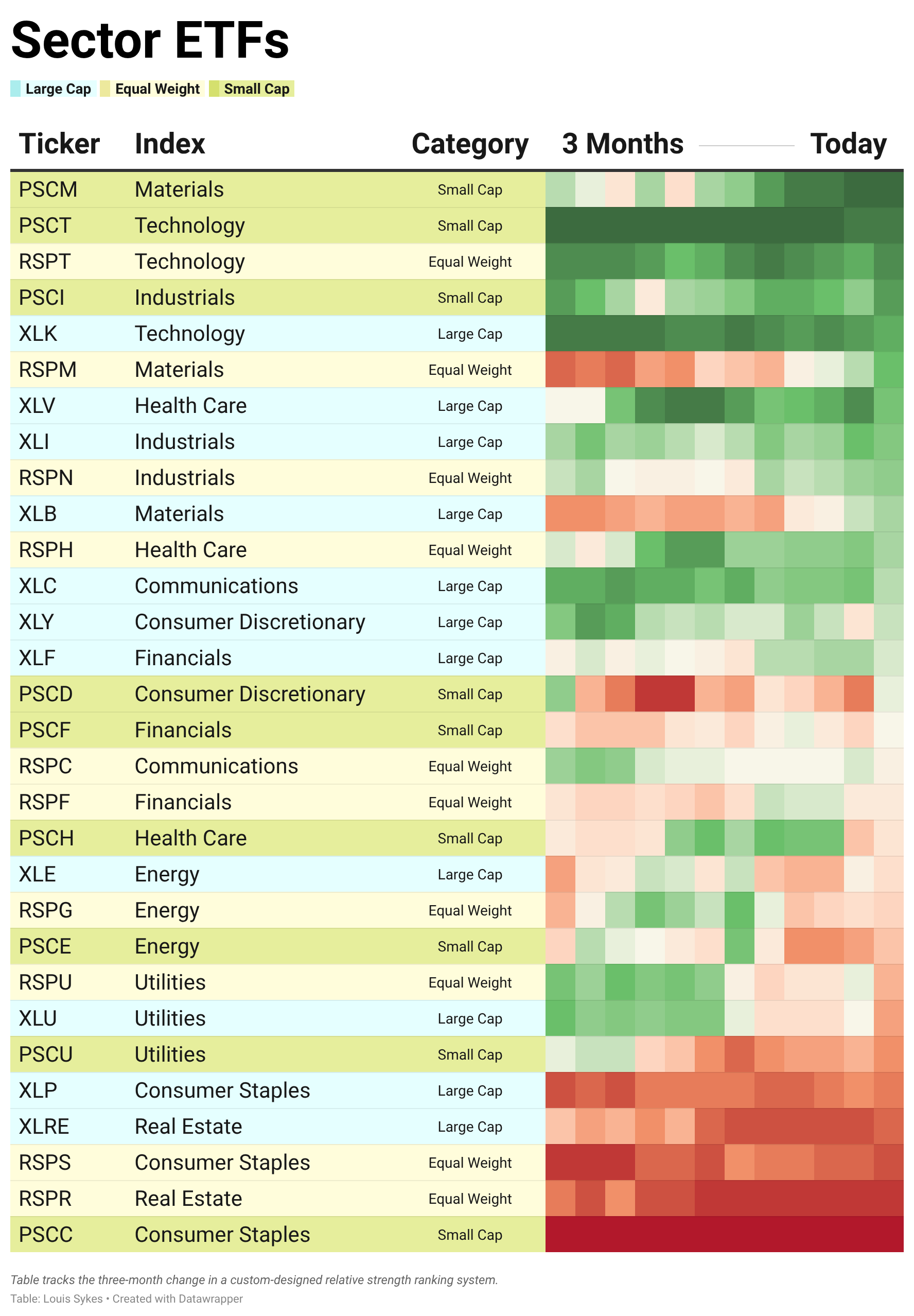 That leadership is showing up clearly in our sector rankings. Small-cap Technology, Materials, and Industrials sit at the top of this week’s table, all outperforming their large-cap counterparts.