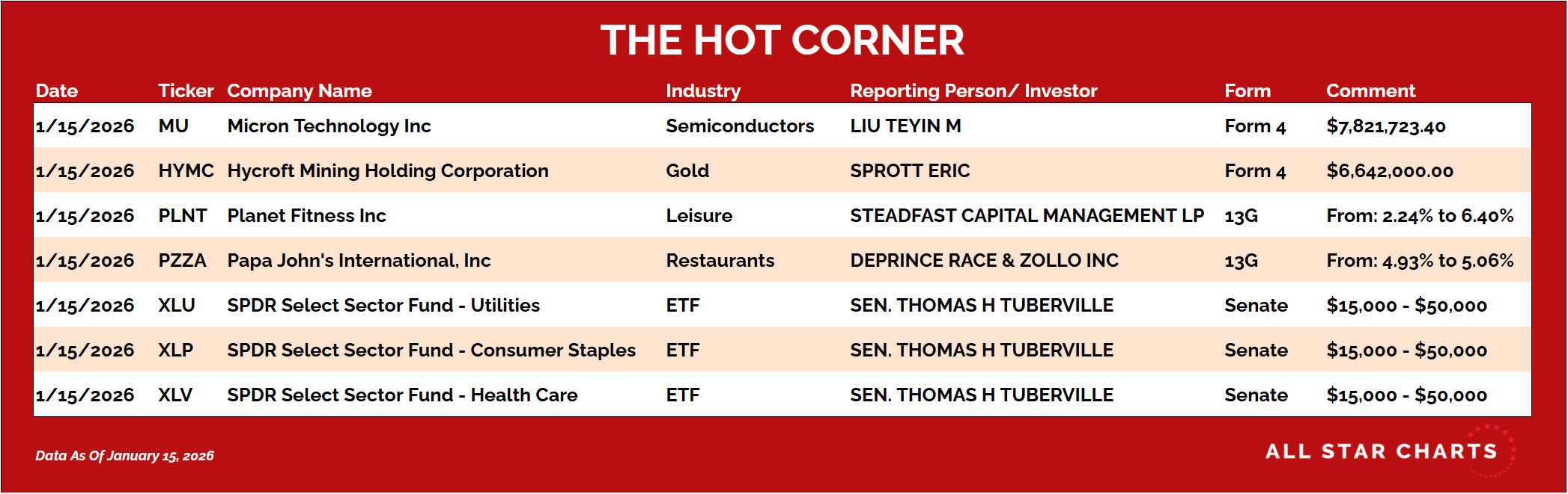 Hereβs The Hot Corner, with data from January 15, 2026: