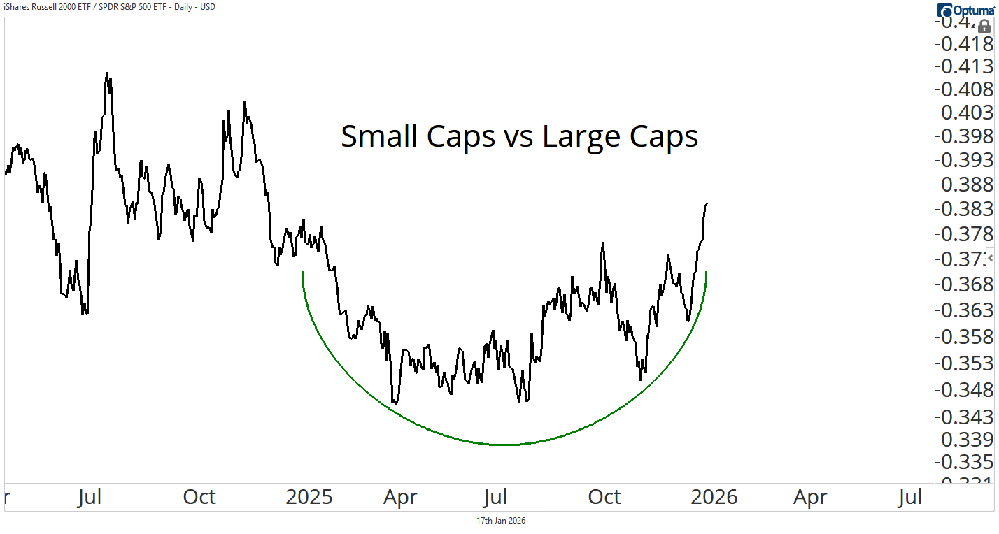 The Russell 2000 ETF $IWM relative to the S&P 500 $SPY (which tracks large-cap stocks), is turning a corner and working higher. We think this is the beginning stages of a more sustained rally in small caps.