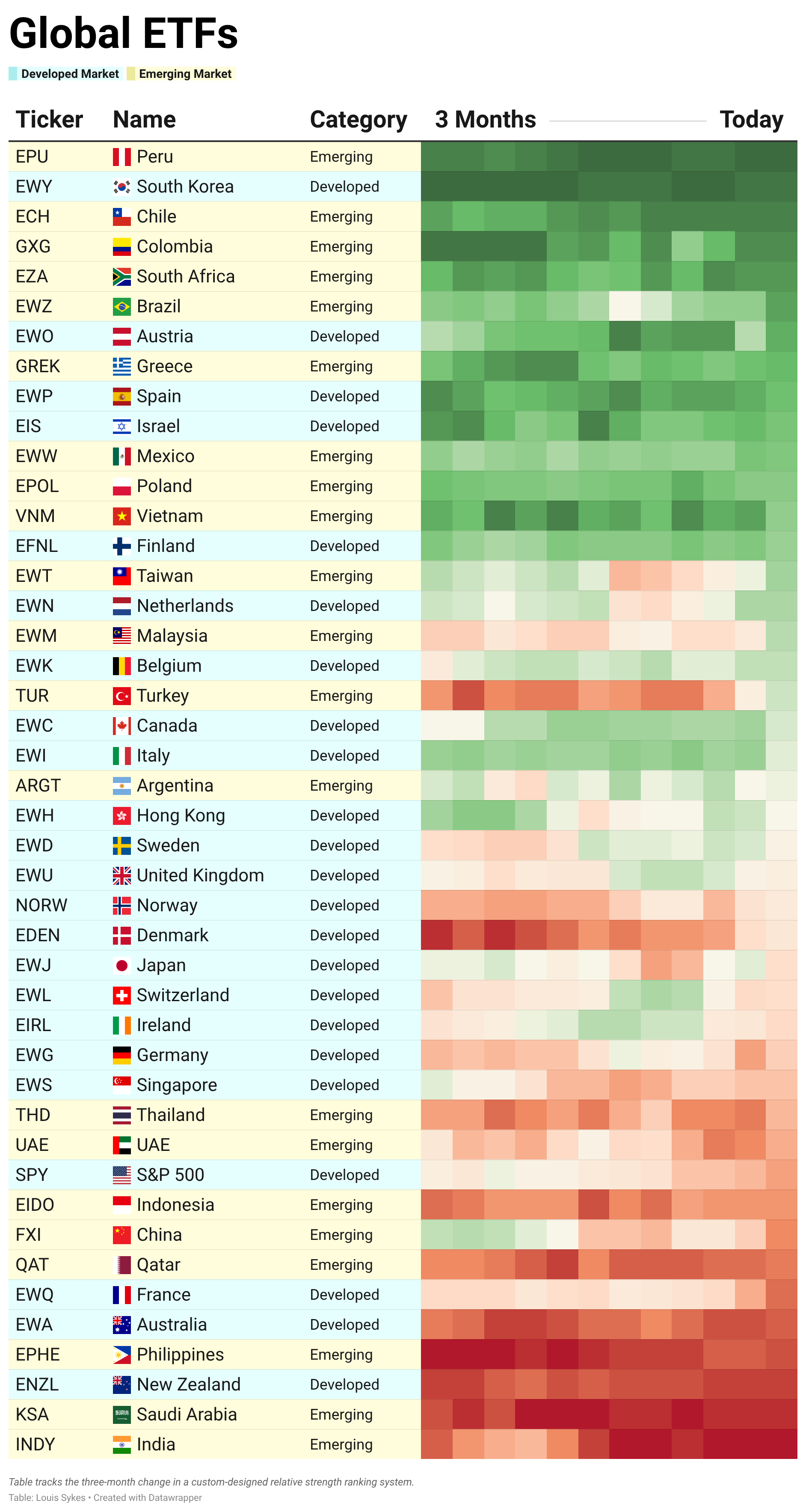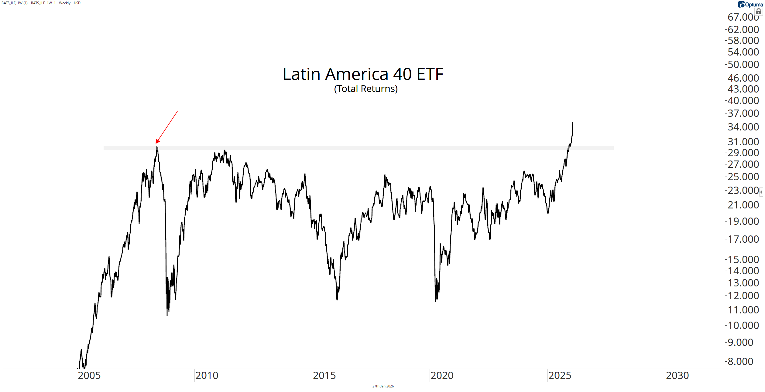 The iShares Latin America 40 ETF $ILF is making all-time highs, breaking above its 2008 peak on a total return basis. Over the past year, it has outperformed the S&P 500 by a wide margin.