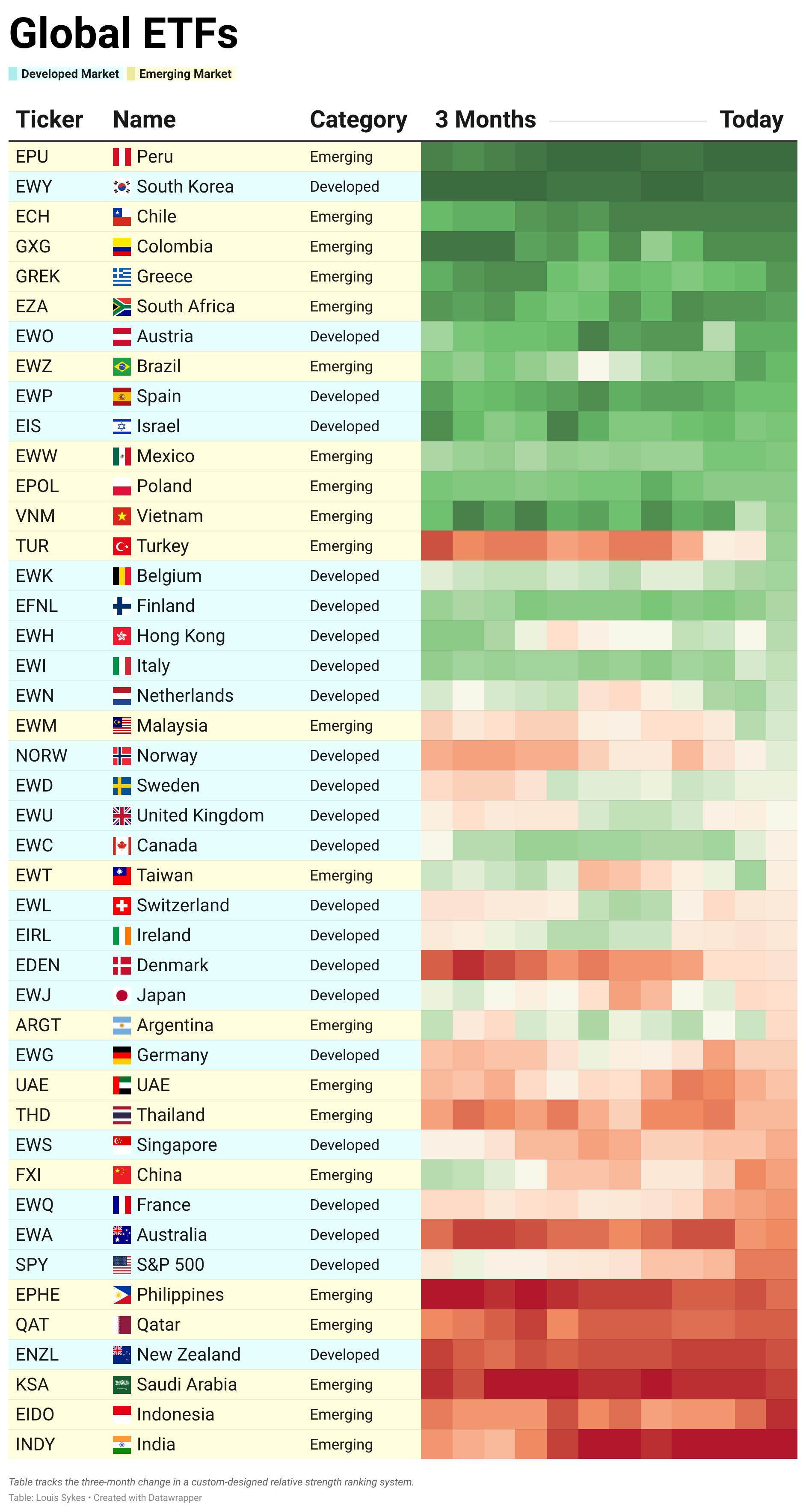 When we map our Power Rankings across global ETFs, the leadership becomes immediately clear. Pockets of Europe and Latin America are lighting up green, while the U.S. and China β markets dominated by growth and technology β sit deep in the red.