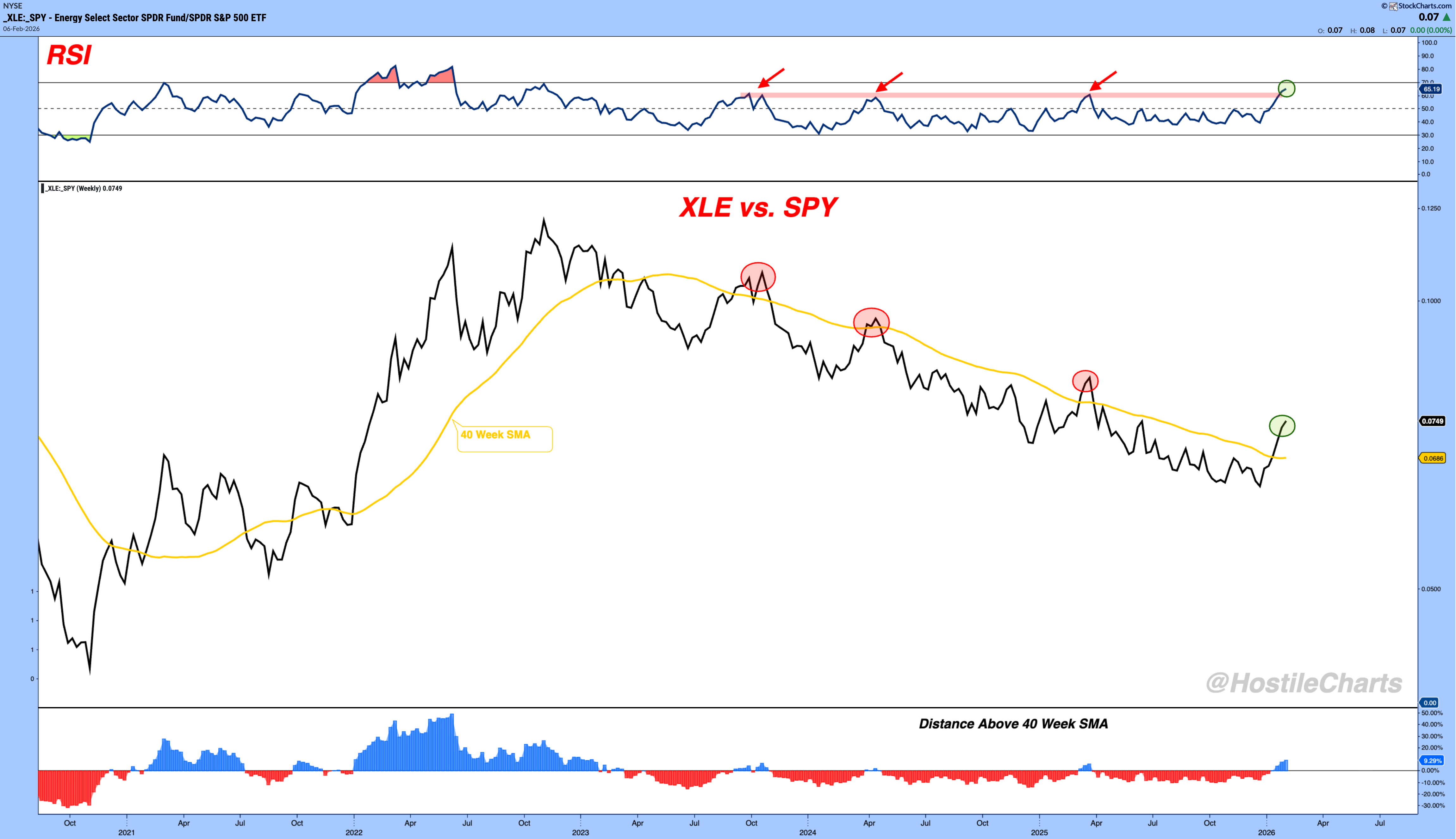 Energy Stocks Look Different This Time This One Chart Explains It All By Larry Thompson February 3, 2026 I’ve written plenty of hate mail over the past three years as energy’s failed breakouts piled up.Hate Mail #1 and Hate Mail #2 and Hate Mail #3 are just a few of them. Because every rally looked promising and every one ran out of gas.But here’s what most people miss.Stocks don’t care if you’re tired of their failed breakouts, so neither should you.That one time you ignore the signal because it “fooled you before” might be the time it actually gets going.So keep executing the trades.Regardless of how you feel.Let’s break it down. First, relative trend.Yes, XLE vs. SPY has tried to turn higher before. That part isn’t new. What is new is that this time it’s actually pushing against the downtrend instead of immediately rolling over.Second, momentum.In downtrends, RSI rallies usually die around 60. That’s been the ceiling for years. This time, momentum is pushing through that level and holding. That’s a meaningful change in character.Third, long-term support.Price is above the 200-day moving average for the largest stretch we’ve seen in years. Even a pullback here would still leave room to buy, instead of forcing you to chase strength or puke weakness. Put those three together and this move looks different. Different enough I might have to write an apology. Anyway, that’s my two cents. Thompson's Two Cents Larry Thompson delivers timeless trading lessons and market wisdom in quick daily notes. More from Thompson's Two Cents Larry Thompson The Sunday Stalk List | Ep. 34 20 Charts I'm Stalking February 1, 2026 Larry Thompson The "Work" Paradox Tomorrow Live at 5pm - All Gas No Brakes | Ep. 7 January 29, 2026 Larry Thompson Why I Added a New Position in CrowdStrike Process > Prediction January 27, 2026 Trade Smarter With Larry’s TakeThompson’s Two Cents offers concise market wisdom, timeless trading lessons, and chart-driven perspective you can trust. You must have JavaScript enabled to use this form. Email Address More from Thompson's Two Cents Thompson's Two Cents Watch Now